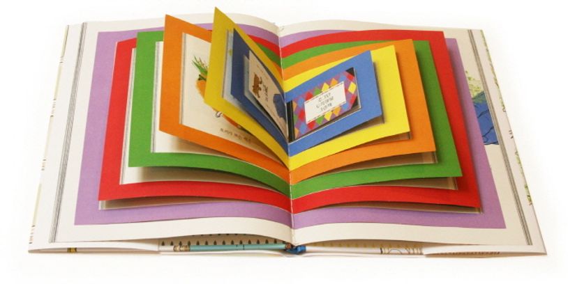 이 책에서는 책장 하나하나가 제각기 책 속 책들의 표지 역할을 하는데, 책장을 넘길 때마다 책 크기가 점점 줄어서 성냥갑만 하게 작아집니다. 책의 가운데를 쫙 펼치면 마치 큰 책 위에 작은 책들을 차곡차곡 쌓아 놓은 것 같은 독특한 모양이새가 됩니다. 어린이들은 이 신기한 책 속에 숨어 있는 일곱 권의 책들을 찾아 책장을 하나하나 넘겨 보는 재미에 푹 빠질 것입니다.