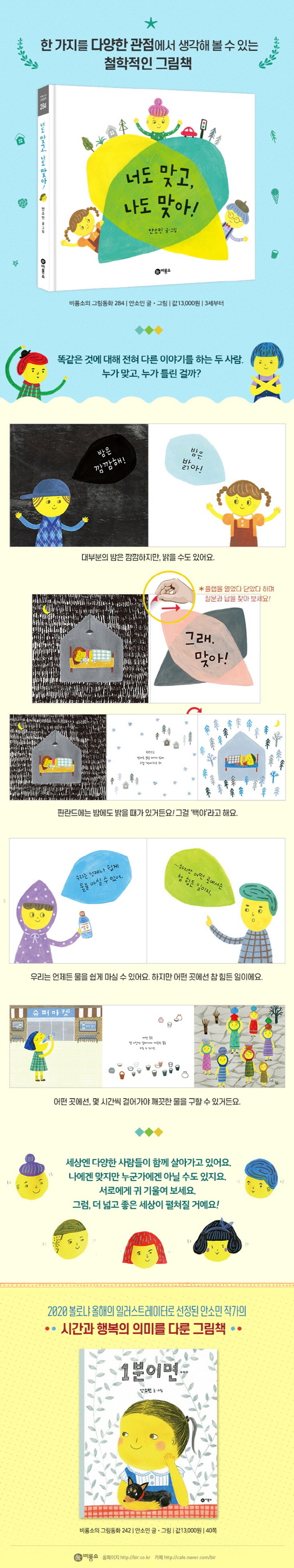 2020볼로냐 올해의 일러스트레이터, 2019 골든 핀휠 영 일러스트레이터 50인에 선정되는 등 세계적으로 주목 받고 있는 작가 안소민의 『너도 맞고, 나도 맞아!』가 ㈜비룡소에서 출간되었다. 안소민 작가는 주로 단순한 구성에 세련된 색감으로 철학적인 메시지를 경쾌하게 담아내 모든 연령층이 함께 즐기는 그림책 작업을 해 왔다. 전작 『1분이면ㆍㆍㆍ』에서는 누구에게나 똑같이 주어진 시간이 어떻게 각각 다르게 느껴질 수 있는지를 보여 줬다면, 이번 책에서는 똑같은 사실이 보는 관점에 따라 다른 진실이 될 수 있다는 걸 알려 준다. 같은 것에 대한 서로 다른 주장에, 정답은 없으며 당사자의 상황과 관점에 따라 다를 수 있다는 철학적인 내용을 단순하면서도 명쾌하게 담아 냈다. 화두가 던져지고 두 가지 색깔의 말풍선이 겹쳐져 있는 “그래, 맞아!”라는 플랩을 열면 양 페이지에 서로 다른 의견이 펼쳐지는 형식으로 되어 있어, 플랩을 열었다 닫았다 하며 다양한 사람들의 의견을 보는 재미가 있다. 질문하고 답하는 형식을 통해 다양한 환경과 문화를 이해하는 계기를 가질 수 있다.