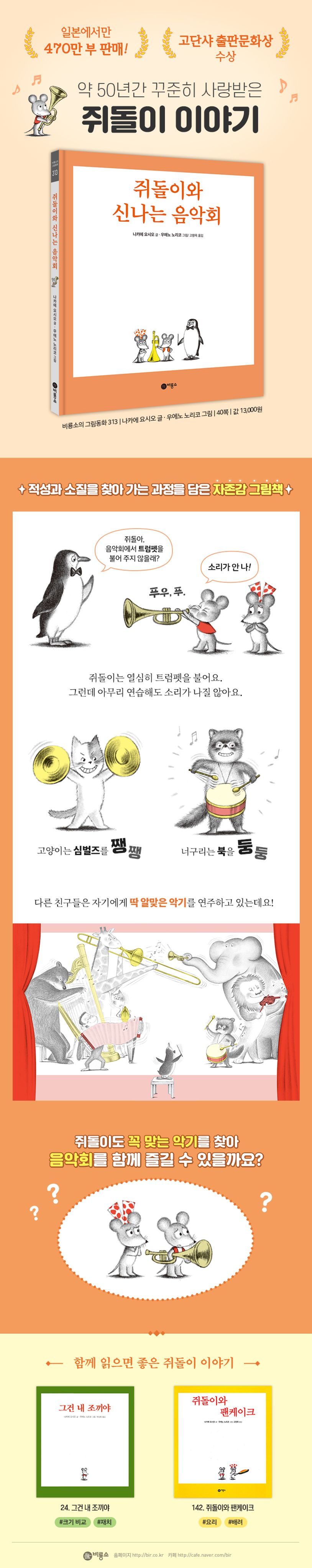 일본의 대표 그림책 작가 부부 나카에 요시오와 우에노 노리코의 베스트셀러 「쥐돌이」 시리즈 중 신간 『쥐돌이와 신나는 음악회』가 ㈜비룡소에서 출간되었다. 「쥐돌이」 시리즈는 일본에서만 470만 부 판매되며 약 50년간 꾸준히 사랑받고 있는 일본의 대표 그림책이다. 시리즈에는 어린아이들이 배워야 할 정서, 인성에 대한 가치가 균형 있게 녹아 있다. 글을 쓴 나카에 요시오는 부끄러움과 겁이 많고, 눈에 띄지 않는 아이였던 자신의 유년 시절 모습을 투영해 ‘쥐돌이’ 캐릭터를 만들었다고 한다. 어린이 독자들은 ‘작은’ 쥐돌이가 기지를 발휘하고, 재치 있게 여러 상황을 헤쳐 나가는 이야기를 읽으며 다양한 가치를 간접적으로 경험한다. 이번 신간 『쥐돌이와 신나는 음악회』에서는 포기하지 않고 적성을 찾기 위해 애쓰는 쥐돌이의 이야기를 담았다.