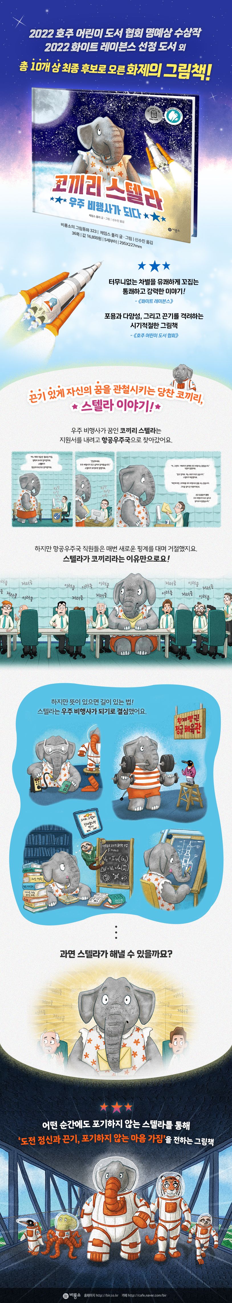 2022 호주 어린이 도서 협회 명예상 수상 및 독일 뮌헨국제어린이청소년도서관 주최 화이트 레이븐스 도서로 선정, 그 외 무려 총 10개의 상 최종 후보로 오른 뜨거운 화제작 『코끼리 스텔라 우주 비행사가 되다』가 ㈜비룡소에서 출간되었다. 코끼리는 우주 비행사가 될 수 없다는 고정관념을 타파하고 자신의 꿈을 당당히 이루는 당차고 사랑스러운 코끼리 스텔라의 이야기를 담은 그림책이다. 단지 코끼리라는 이유만으로, 터무니없는 핑계를 대며 스텔라는 우주 비행사가 될 수 없다고 단정 짓는 항공우주국 직원들을 풍자하며 다양성과 포용에 대한 메시지를 위트 있게 전한다.