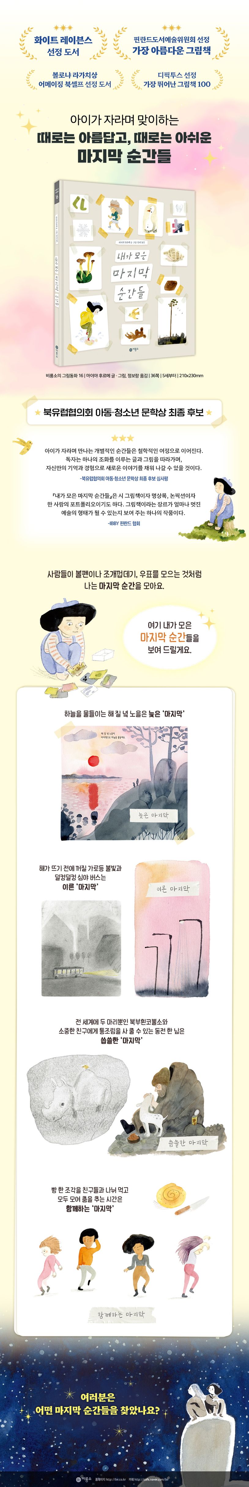 아이의 시선으로 바라본 다양한 마지막 순간들을 담은 『내가 모은 마지막 순간들』이 ㈜비룡소에서 출간되었다. 살아가면서 경험하는 다양한 마지막을 하나의 앨범처럼 차곡차곡 모은 그림책으로, 프랑스, 스웨덴, 헝가리 등 전 세계 8개국에 출간되어 사랑받았다. 핀란드의 사계절과 자연의 모습을 담은 일러스트로 핀란드도서예술위원회 선정 가장 아름다운 그림책 및 화이트 레이븐스 도서로 뽑히기도 했다. 또한, 북유럽 문화에 관심을 높이고 독창적인 예술 활동을 기리기 위해 북유럽협의회가 제정한 아동·청소년 문학상 최종 후보에 올랐다. 후보 선정 당시 심사위원은 “아이가 모은 순간들은 폭넓은 해석이 가능한 시각적 시를 연상시킨다.”라고 평한 바 있다. 수채화와 색연필로 그려낸 서정적인 풍경과 여러 인종, 각기 다른 나이대의 인물들이 이야기하는 마지막을 통해 여러 삶의 단면을 보여 주는 그림책이다.