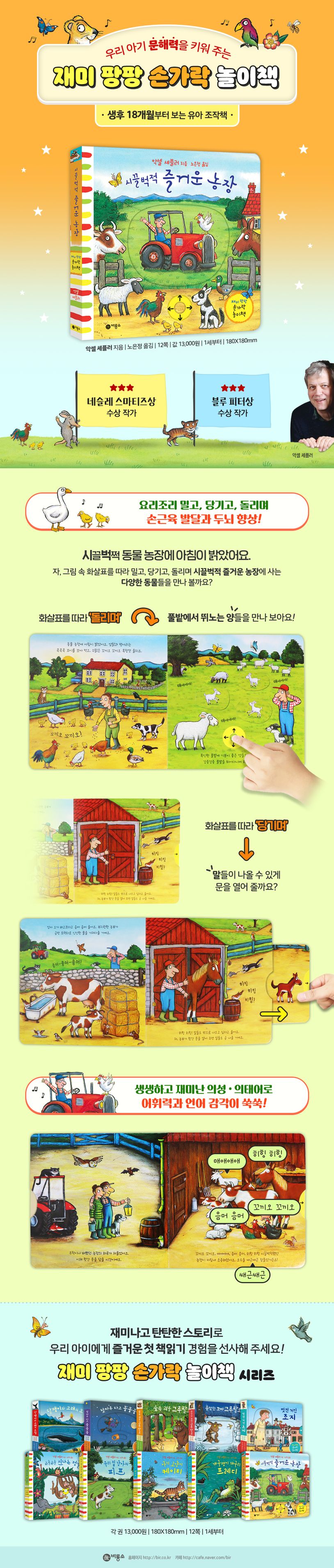 시끌벅적 동물 농장에 아침이 밝았어요. 암탉과 병아리는 콕콕콕 모이를 쪼아 먹고, 수탉은 꼬끼오 꼬끼오 목청껏 울지요. 그림 속 화살표를 따라 밀고, 당기고, 돌리며 시끌벅적 즐거운 농장 동물들을 만나 보아요!