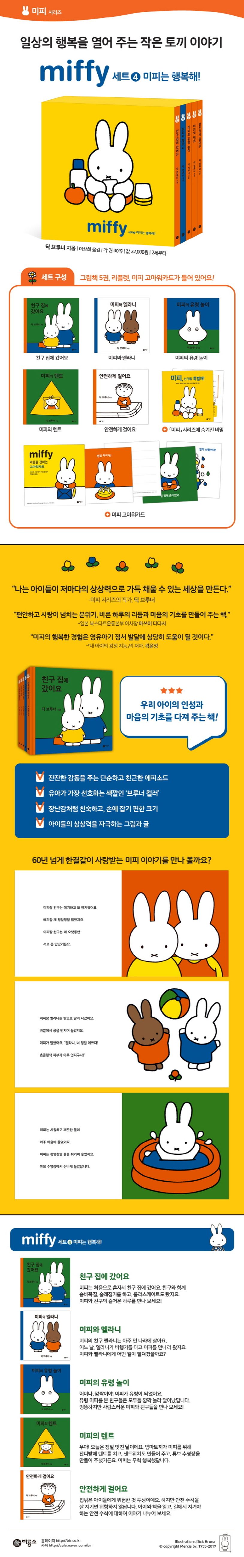 「미피」 시리즈의 네 번째 세트인 「미피는 행복해!」는 미피의 사랑스럽고 따뜻한 하루가 담긴 이야기들을 모았습니다. 『친구 집에 갔어요』는 미피가 태어나서 처음으로 혼자서 버스를 타고 친구를 만나러 가는 이야기예요. 『미피와 멜라니』에서는 먼 나라에 사는 친구 멜라니가 비행기를 타고 미피를 만나러 오는 이야기를 담았어요. 『미피의 유령 놀이』는 미피가 유령이 되어 친구들을 깜짝 놀라게 하는 엉뚱하고 사랑스러운 하루가 펼쳐집니다. 『미피의 텐트』에서는 텐트 안에서 신나게 놀고 튜브 수영장에서 첨벙첨벙 물놀이하는 미피의 즐거운 하루가 소개됩니다. 『안전하게 걸어요』에서는 주인공이 보도를 따라 걸으며 아이들이 꼭 알아야 하는 교통안전을 쉽게 알려 줍니다. 매일 매일 새로움을 마주하는 아이들에게 미피의 이야기는 따뜻한 응원과 용기를 선사합니다. 또 평범한 일상 속 즐거움을 찾는 비법도 알려 준답니다. 더불어, 아이들은 일상생활에서 꼭 알아야 할 교통안전 수칙도 쉽고 재미있게 배울 수 있습니다.