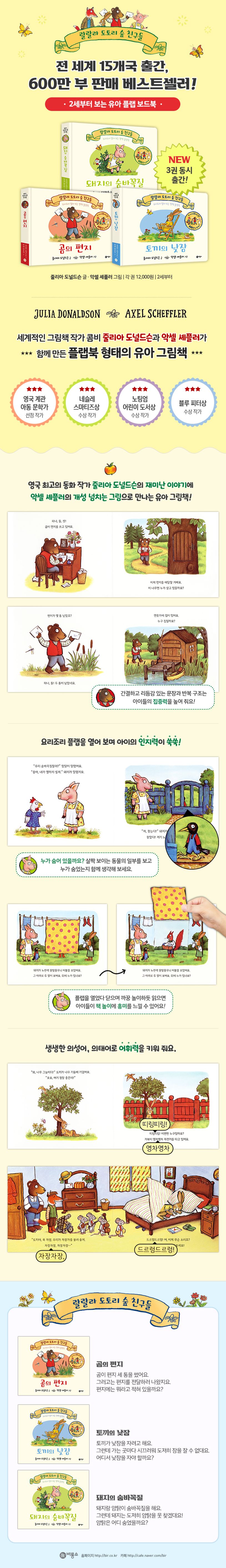 세계적인그림책작가콤비줄리아도널드슨과악셀셰플러의플랩북형태의재미난유아그림책전세계15개국에서출간되며600만부이상판매된최고의유아그림책베스트셀러「랄랄라도토리숲친구들」시리즈가㈜비룡소에서동시출간되었다.이시리즈는총4권『곰의편지』,『여우의양말』,『토끼의낮잠』,『돼지의숨바꼭질』로구성되어있으며,영국최고의동화작가줄리아도널드슨의재미난이야기에악셀셰플러의개성넘치는그림이만나명성에걸맞은유아플랩북을만들었다.특히유아들이가장좋아하는구조인요리조리열어보는까꿍형태의그림책으로아이들의인지력은물론,관찰과유추,상상력까지키워준다.반복되는구조의짧은문장과다양한의성어,의태어는아이들의어휘력을풍부하게향상시켜줄것이다.■재미난스토리텔링과집중도를높이는짧은문장와반복구조「랄랄라도토리숲친구들」시리즈는유아들의일상인낮잠자기,숨바꼭질,옷입기,생일파티등유아들의눈높이에꼭맞춘이야기들로아이들의몰입도를높인다.영국계관문학상을받은줄리아도널슨의간결하고리듬감있는문체와셰플러의개성넘치고아기자기한그림은읽고보는재미를준다.또1~4세유아의특성에맞는반복구조이야기는아이들의집중도를높여주고,다양하고생생한의태어,의성어가가득한경쾌한문장들은언어감각과어휘력을키워줄것이다.■요리조리플랩을열고닫으며관찰력과인지력이쑥쑥!손바닥보다조금큰사이즈의보드북형태의「랄랄라도토리숲친구들」시리즈는모든페이지마다플랩이부착된까꿍그림책이다.놀이하듯플랩을열었다닫았다하는사이아이들의관찰력과인지력이자연스레자라날것이다.또플랩을열어보기전,무엇이들어있을지상상해보는과정은호기심가득한아이들의상상력을자극한다.또한플랩을열어정답을찾아나가는동안성취감을느끼며책읽기에재미와흥미를갖게될것이다.
