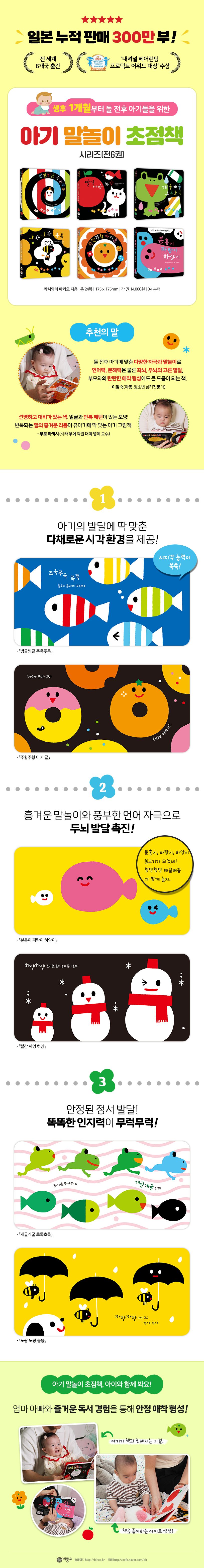 사물에 반응하고 눈의 초점을 맞추기 시작하는 생후 1개월부터 돌 전후 아기까지 두루두루 볼 수 있는 아기 말놀이 초점책이 나왔다. 총 6권으로 구성된 이 시리즈는 색, 모양, 동물, 사물, 음식 등 아기 실생활에 밀접한 소재를 단순화해 인지하기 쉽게 시각화시켰다. 빨강, 노랑, 파랑, 초록, 검정을 주조색으로 선명한 색 대비를 통해 아기들이 집중해 볼 수 있다. 직선과 곡선, 점, 동그라미와 네모, 세모 등 단순하면서도 움직임이 강한 형태의 모양들이 한 면에서 조화롭게 구성되었다. 다양한 형태와 색에 눈을 맞추고 반응하면서 아기는 시지각 능력이 자연스럽게 발달한다. 특히 긴 시간 집중하기 어려운 영유아의 특성을 고려해 매장마다 색대비가 모두 다르게 구성했다. 다채로운 색의 변화를 따라가다 보면 아이들이 끝장면까지 호기심을 가지고 집중할 수 있다. 또 각 권 마지막 부분에 펀칭이 되어 있어 다음장을 열어 구멍 속에 들어간 사물이나 캐릭터를 확인할 수 있다. 손가락을 넣어보고, 만져 보고 하면서 호기심을 유발하는 까꿍놀이로 즐겁게 마무리할 수 있는 구성이다.