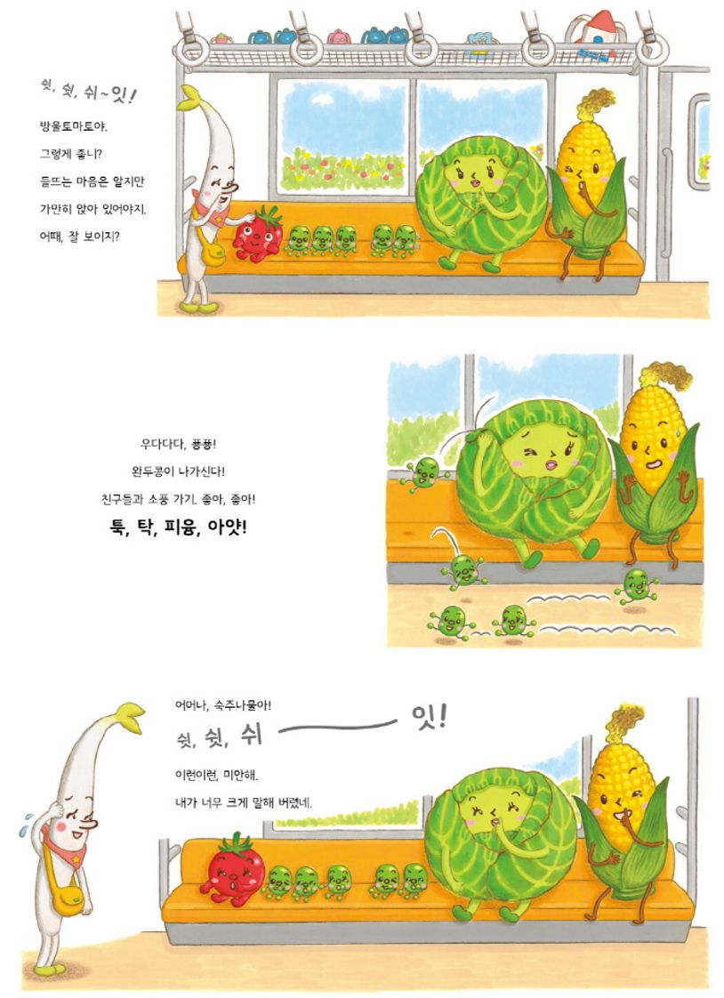「울랄라 채소 유치원」 시리즈는 부모들이 아이를 기르며 흔히 어려움을 겪는 목욕하기, 잠자기, 아침에 일어나기 같은 기본적인 생활 습관부터 사과하기, 고마워하기, 공중 예절, 울며 떼쓰지 않기 등 배려와 공동체 생활 예절까지 두루 일깨워 주는 건강한 그림책이에요. 특히 의인화된 귀여운 채소 캐릭터는 아이가 자연스럽게 채소와 친숙해질 수 있는 좋은 기회이며, 뭐든 스스로 해 나가는 채소 친구들을 보면서 아이가 ‘나도 할 수 있다.’는 자신감을 얻을 수 있게 도와줍니다.