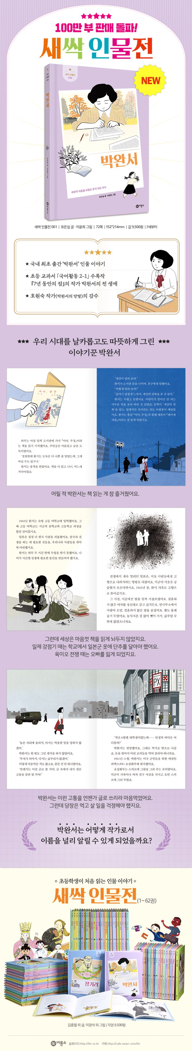 초등학생이 처음 읽는 인물 이야기 「새싹 인물전」 61권 『박완서』가 ㈜비룡소에서 출간되었다. 시리즈 100만 부 판매를 기념해 8년 만에 내놓는 신간으로, 국내 최초 ‘박완서’ 인물 이야기이다. 6.25 전쟁 이후 현대 한국 사회의 아픔과 부조리들을 날카롭고도 따뜻하게 그린 한국 대표 작가, 박완서의 일생을 담았다. 초등 교과서에 실린 『7년 동안의 잠』으로 그 이름은 들어 봤지만, 자세히 모르는 어린이들을 위해 마련되었다.
