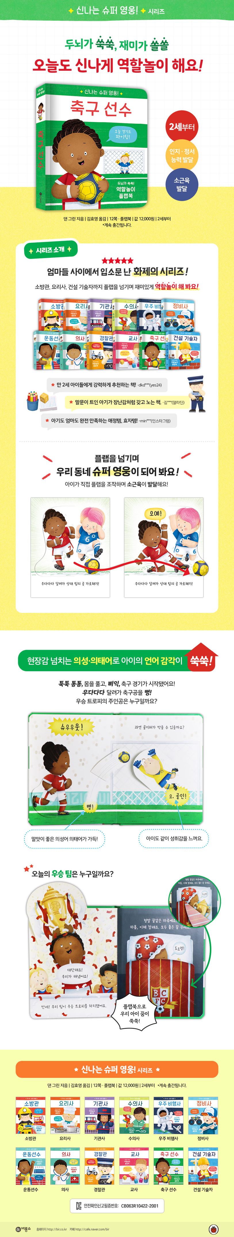 플랩을 열면 그림이 바뀌며 강력한 몰입감을 선사하는 신개념 플랩북 「신나는 슈퍼 영웅!」 시리즈. 세계적인 출판사 LADYBIRD BOOKS에서 출간한 원작 시리즈는 마치 주인공이 된 것 같은 생생함과 세련된 디자인으로 이미 전 세계 여러 나라에서 큰 인기를 얻고 있지요. 이번엔 『축구 선수』를 만나 봐요. 장난감을 가지고 노는 것처럼 재미있는 이 시리즈는 손과 눈의 협응력, 미세한 손의 운동 능력 등 소근육 발달에 그만이랍니다.