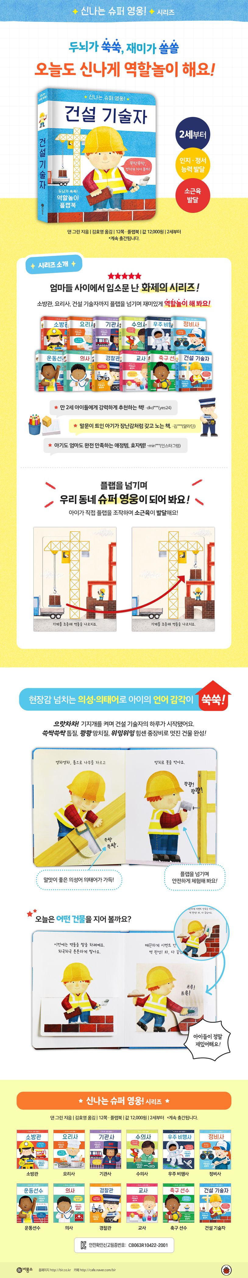 플랩을 열면 그림이 바뀌며 강력한 몰입감을 선사하는 신개념 플랩북 「신나는 슈퍼 영웅!」 시리즈. 세계적인 출판사 LADYBIRD BOOKS에서 출간한 원작 시리즈는 마치 주인공이 된 것 같은 생생함과 세련된 디자인으로 이미 전 세계 여러 나라에서 큰 인기를 얻고 있지요. 이번엔 『건설 기술자』를 만나 봐요. 장난감을 가지고 노는 것처럼 재미있는 이 시리즈는 손과 눈의 협응력, 미세한 손의 운동 능력 등 소근육 발달에 그만이랍니다.