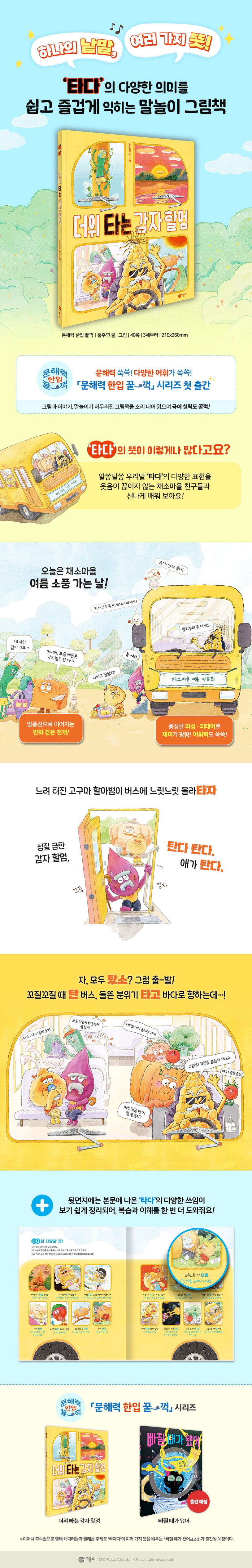 그림과 이야기, 말놀이가 한데 어우러진 그림책을 소리 내어 읽으며 어휘력과 문해력을 자연스럽게 키우도록 기획된 시리즈 「문해력 한입 꿀꺽」이 ㈜비룡소에서 새롭게 출간되었다. 이 시리즈는 그림책이 주는 즐거움을 그대로 살리면서, 듣기, 말하기, 읽기, 쓰기, 문법, 문학적 요소 들을 골고루 넣어 초등 대비 국어 교과 과정에 잘 맞도록 구성되었다. 아이들이 글과 그림을 보며 우리말과 글을 쉽고 즐겁게 배우도록 돕는 데 초점을 맞춘다. 우리말은 같은 낱말로도 수많은 쓰임새가 있어 상황에 따라 정확하게 쓰는 게 쉽지가 않다. 대신 익숙해지면, 그만큼 언어의 세계가 폭넓게 확장되는 만큼 이번 시리즈는 아이들에게 우리말의 재미를 확실하게 보여 주도록 기획되었다. 바로 문해력의 시작점이라 할 수 있는 같은 단어의 여러 쓰임새를 재미있게 알려 준다. ①그림만 보고 장면을 유추하는 감각 ② 글과 그림을 맞춰 의미를 확인하는 감각 ③글만으로 문맥을 파악하는 감각까지, 이러한 단계를 거치다 보면 자연스레 문해력도 한층 더 단단해질 것이다. 첫 번째 그림책 『더위 타는 감자 할멈』은 ‘타다’라는 단어를 가지고 불이 타다, 버스를 타다, 부끄러움을 타다 등 다양한 쓰임을 재치 있게 풀어낸 말놀이 그림책이다. 아이는 장면마다 숨은 ‘타다’를 스스로 찾아 뜻을 짚어 보며 자연스럽게 어휘와 문해력의 기초를 다진다. 이어서 후속권으로 빨래 캐릭터들과 빨래를 주제로 ‘빠지다’의 여러 가지 뜻을 배우는 『빠질 때가 됐어』(근간)가 출간될 예정이다.