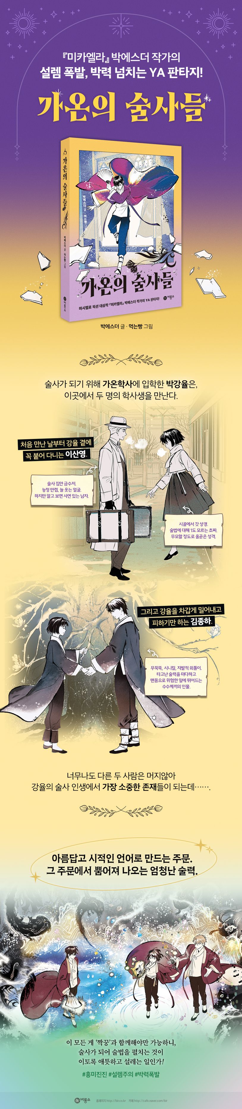 박에스더의 판타지 신작 『가온의 술사들』이 비룡소에서 출간되었다. 『미카엘라』로 101명의 어린이 심사위원들이 직접 뽑는 No.1 마시멜로 픽션 대상을 받으며 등장한 박에스더 작가는 독자들의 열렬한 지지와 사랑 속에 「미카엘라」시리즈를 5권으로 완결하고, 이후에도 자신만의 독특한 스타일로 판타지와 영어덜트 장르에서 신선한 행보를 계속해 오고 있다.