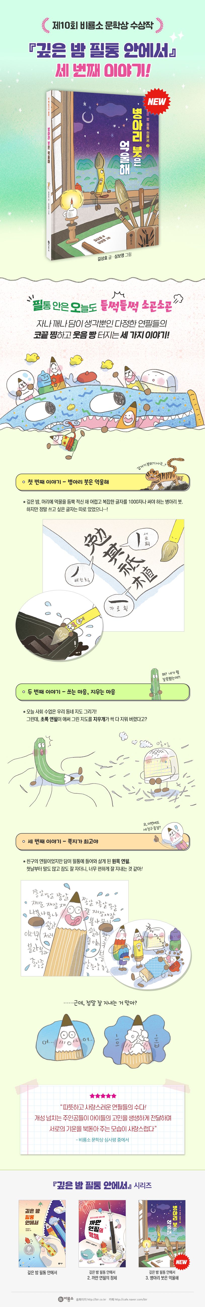 『병아리 붓은 억울해』가 비룡소에서 출간되었다. 날마다 무언가를 쓰고 지우는 아이들의 일상 가운데, 연필을 비롯한 필통 속 친구들은 또 어떤 ‘일상’을 살아갈까? 쓰고 지우는 일을 하지 않을 때, 이들은 무엇을 하고 어떤 이야기를 나눌까? 하는 상상에서 출발한 「깊은 밤 필통 안에서」 시리즈가 세 번째 이야기로 독자들을 찾아간다. 각 권마다 세 가지 에피소드가 담겼으므로 지금까지 모두 아홉 가지 이야기가 나온 셈이다. 날마다 새로운 사건으로 수다가 끊이지 않지만 관심사는 오직 그들의 주인인 ‘담이’에게만 향해 있는 사랑스러운 연필들의 이야기는, 어린이들에게 까르르 터지는 웃음뿐 아니라 마음 든든한 위로마저 되어 줄 것이다. 누구나 자기 필통 속 친구들의 응원과 사랑을 받는 유일한 주인일 테니 말이다.