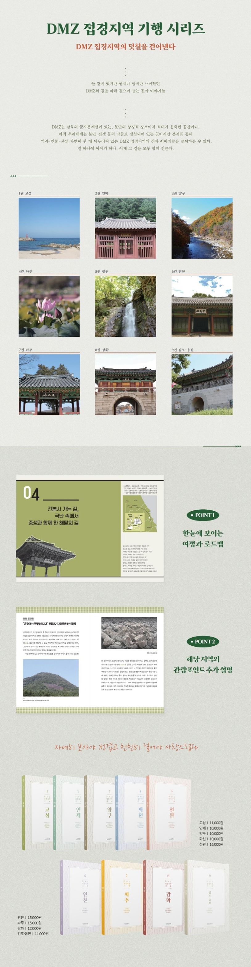 『DMZ 접경지역 기행』시리즈는 유일한 통일 관련 연구소인 건국대학교 통일인문학연구단에서 5년 동안 DMZ 접경지역을 직접 답사하면서 축적한 인문적 연구를 집필한 답사기이다. 본서는 여행용 서적으로 실제 책을 가지고 다니면서 활용할 수 있도록 DMZ 접경지역을 구성하고 있는 고성군, 인제군, 양구군, 화천군, 철원군, 연천군, 파주시, 강화군, 김포시 옹진군을 각 시군청 단위별로 나누어 출판했다. 책 중간마다 관람 포인트도 있으니, 참고하면 더욱 알찬 여행이 될 것이다.
