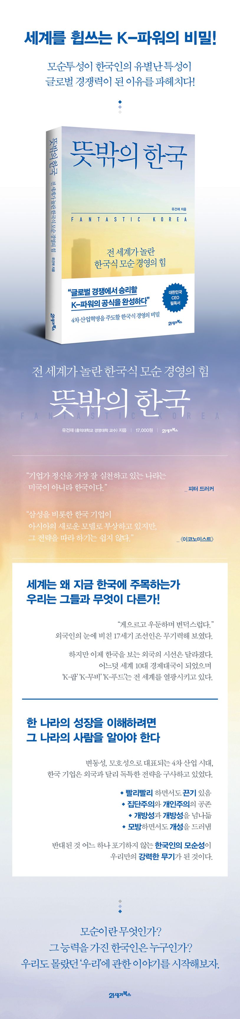 문화 및 경제 등 전 세계가 주목하는 K-파워의 비결은 무엇일까? 『뜻밖의 한국』은 ‘한국식 경영 전략’을 정리한 최초의 책이자, 한국인의 특성을 경영학적으로 접근한 의미 있는 연구이다. 이 책의 저자 유건재 교수(홍익대 경영대학)는 한국식 경영의 본질을 찾기 위해 먼저 한국인의 특성을 분석했다. 그리고 그 결과 일관적인 패턴 하나를 발견할 수 있었다. 한국인은 매우 복잡하고 모순이 가득한 사람들이며, 이런 특성이 기업 및 문화 경영에 그대로 적용되어왔다는 점이다.