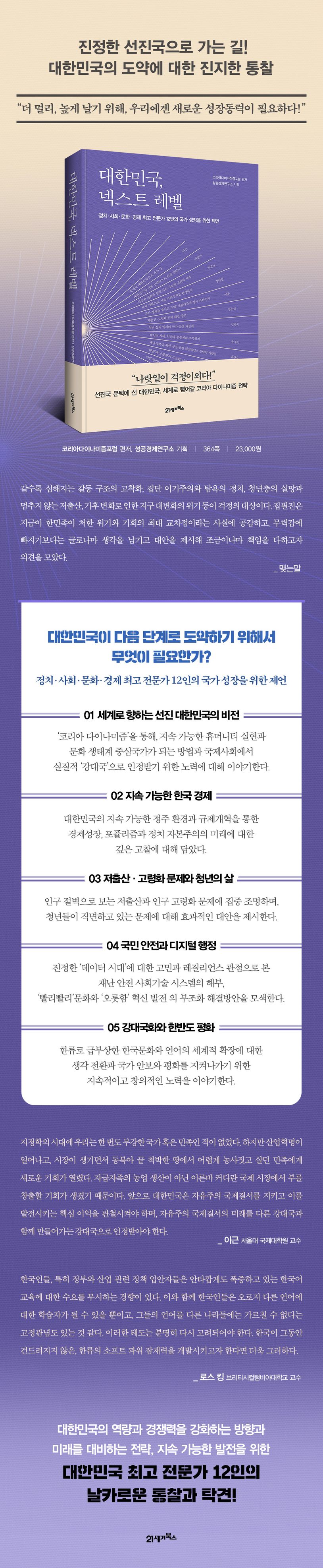 경제경영전문가 네트워크인 성공경제연구소를 중심으로 대한민국 미래에 탁견을 지닌 각 분야의 전문가 12인이 의기투합하여 결성한 코리아다이나미즘포럼은 현시대에 꼭 필요한 국가 성장을 제언으로 이 책을 펴냈다. 각 분야의 최고 전문가들의 날카로운 시각과 오랜 경험을 바탕으로 분석한 『대한민국, 넥스트 레벨』에는 선진국 문턱에 선 대한민국의 현주소와 국제적 역할·정치·경제·사회·문화적 측면에서의 발전 방향에 대한 전망과 국가 비전이 담겨 있다. 책 속에 빼곡하게 담긴 나라 걱정과 미래에 대한 고민의 흔적을 따라가다 보면 우리 사회와 경제를 폭넓게 바라보는 시야가 생겨 대변화의 시대에 올바른 길을 찾을 수 있는 지혜를 얻을 수 있다.