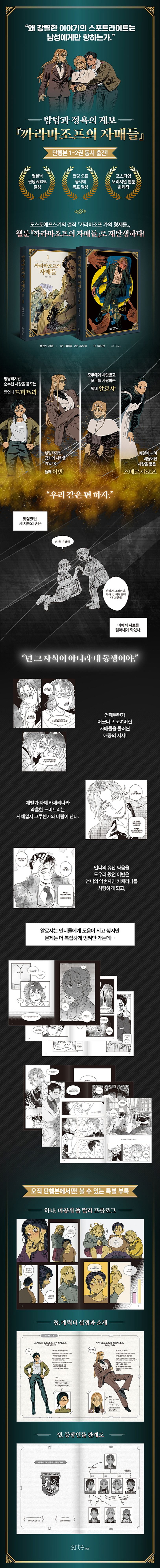 웹툰 연재작 『까라마조프의 자매들』은 독특한 그림체와 눈에 띄는 연출력으로 흑백 만화의 정수를 담아낸 수작이다. 이번에 새로 출간된 『까라마조프의 자매들』 1~2권은 총 28화까지 연재된 스토리를 담아낸 것은 물론, 정원사 작가가 새로 그린 표지 일러스트에 고급스러운 표지 디자인을 입혔으며, 캐릭터 설정화(알료샤, 스메르쟈코프)와 세 자매의 어린 시절을 엿볼 수 있는 풀 컬러 프롤로그 이야기를 수록했다.