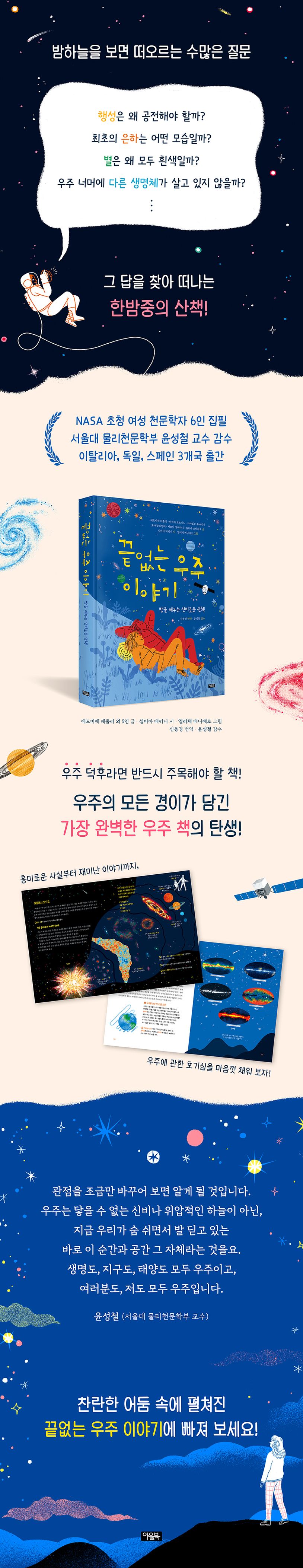 《끝없는 우주 이야기》는 실제로 초기 블랙홀을 연구하고 있는 이탈리아의 여성 천문학자 6인(에드비제 페출리, 마리아 오로피노, 라파엘라 슈나이더, 로사 발리안테, 시모나 갈레라니, 툴리아 스바라토)이 직접 기획하고 집필한 책이라는 점으로 더욱 기대를 모은다. 특히 우주를 향한 열정을 꽃피우기 시작한 어린이 청소년을 위해 우주를 쉽게 설명했다는 점이 이 책의 가장 큰 특징이지만, 그 전문성만큼은 성인 독자에게도 손색이 없을 만큼 공고하다. 이탈리아를 시작으로 독일, 스페인의 3개국에서 출간되었다는 사실이 그 가치를 보증해 주는 듯하다. 《끝없는 우주 이야기》 한국어판에는 생생한 번역과 대한민국 대표 천문학자인 윤성철 교수의 감수까지 더해지며 더욱 생생한 ‘우주 산책’ 이야기가 탄생했다.