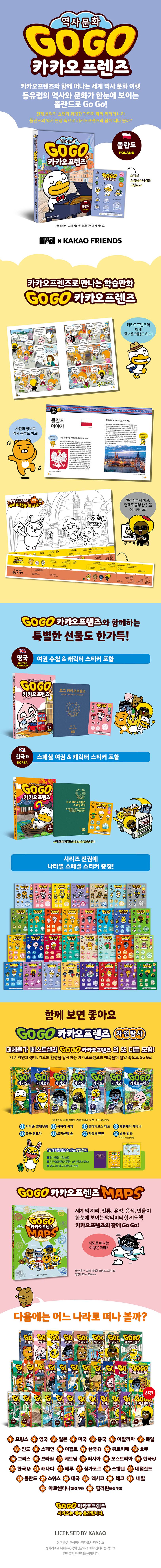 출간된 지 5년 만에 누적 판매 200만 부 돌파한 대체 불가 베스트셀러 학습만화 〈Go Go 카카오프렌즈〉 시리즈! 〈마법천자문〉으로 학습만화의 시장을 연 아울북과 카카오프렌즈가 만나 탄생시킨 이 시리즈에서 카카오프렌즈의 라이언, 무지, 콘, 네오, 프로도, 튜브, 제이지, 어피치는 자신들의 성격을 드러내며 귀엽고 사랑스러운 매력을 내뿜는다. 〈Go Go 카카오프렌즈〉 시리즈는 카카오프렌즈가 시간여행의 주인공이 되어 펼쳐지는 이야기로 독자들은 카카오프렌즈의 재기발랄한 여행을 통해 세계 곳곳의 다양한 역사와 문화를 경험한다. 깜찍한 캐릭터의 매력에 재미있는 스토리와 알찬 정보까지 겸비한 책으로, 어린 독자와 부모님의 마음까지 사로잡아 출간되자마자 베스트셀러에 올라 시리즈 전체가 꾸준한 사랑을 받고 있다.