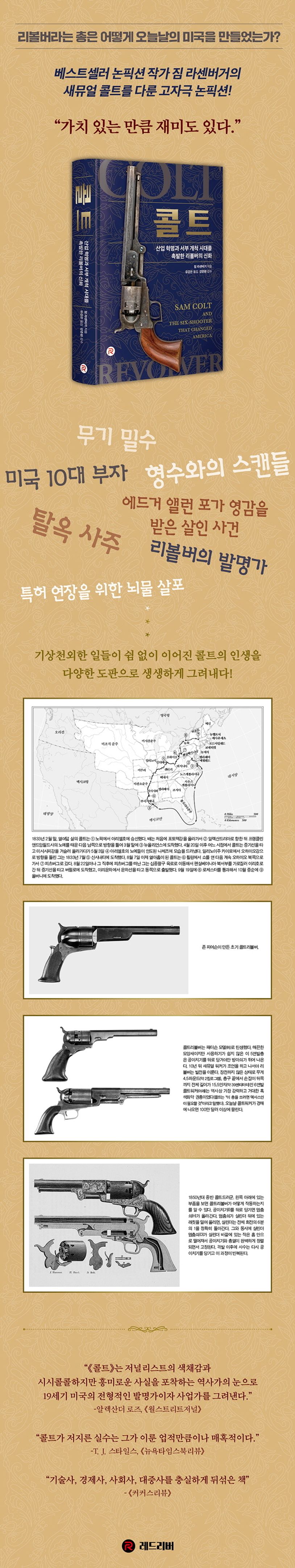 콜트는 리볼버를 창조한 동시에 리볼버의 대명사가 되어 콜트라는 이름을 역사에 남겼다. 하지만 정작 새뮤얼 콜트라는 인물은 여전히 베일에 싸여 있다. 그는 당시 미국 10대 부호이자 미국 산업 혁명의 기수였고 서부 개척 시대의 주인공임에도 말이다. 〈뉴욕타임스〉 기자이자 논픽션 베스트셀러 작가인 짐 라센버거는 철저한 연구 조사를 통해 새뮤얼 콜트의 진짜 모습을 그려낸다. 흥미진진한 탐사 보도를 읽는 듯한 이 책은 리볼버의 탄생부터 콜트 무기 공장의 번성을 남북 전쟁, 미국 산업 혁명, 골드러시 등 굵직한 역사적 사건들을 배경으로 풀어 놓는다. 총기 마니아는 물론 미국사에 관심 있는 사람들은 콜트를 다시 보게 될 것이다. 게다가 서스펜스를 동반한 일화들이 끊임없이 몰아치기에 논픽션으로서의 재미도 훌륭하다.