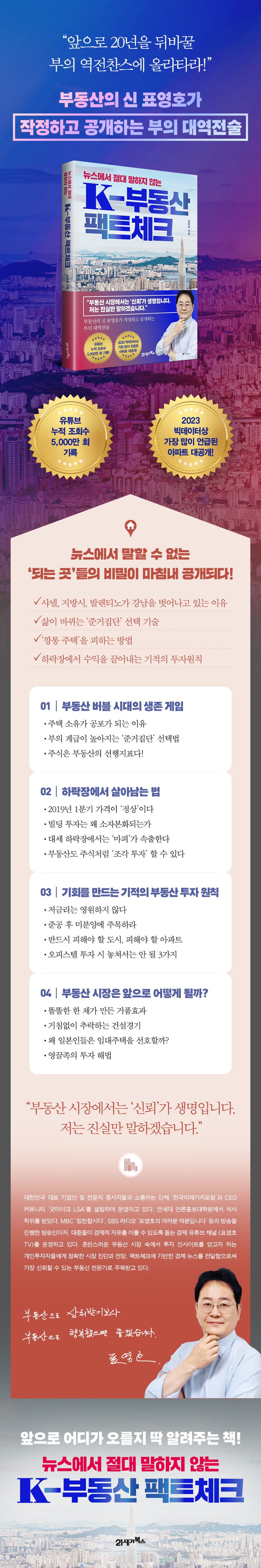 『뉴스에서 절대 말하지 않는 K-부동산 팩트체크』는 한국 부동산 시장을 가장 현실적으로 조명하고 있는 대한민국 대표 부동산 팩트체커 표영호가 정보의 옳고 그름을 판단하기 힘든 개인투자자를 위해 단 한 권으로 정리한 부동산 투자 바이블이다. 자극적인 타이틀 속에 숨어 있는 시장의 진짜 흐름을 파악하지 못하는 초보투자자에게 왜곡된 시장의 진실을 공개하고 보석 같은 투자 찬스를 혼자서도 깨달을 수 있게 돕는다.