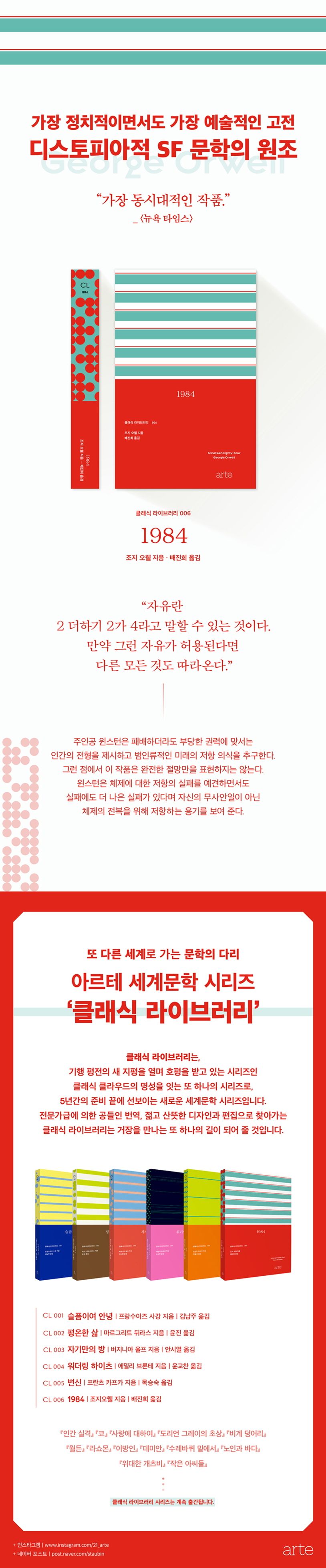 시간이 지날수록 ‘천재’의 반열에 오르고 있는 조지 오웰의 탁월한 저항 소설 『1984』가 아르테에서 출간되었다. 조지 오웰을 전공한 배진희가 맡아서 오웰이 쓴 문장부호 하나까지도 고심해 가며 우리말로 옮겼다.