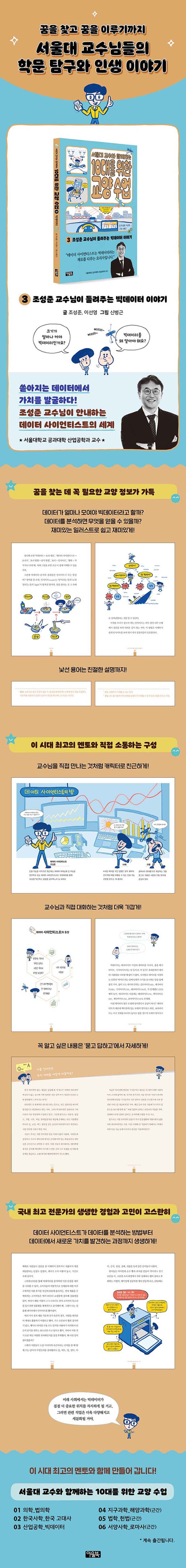 〈조성준 교수님이 들려주는 빅데이터 이야기〉는 『서울대 교수와 함께하는 10대를 위한 교양 수업』 시리즈의 세 번째 권으로, 현대 정보 사회의 중요한 자원인 빅데이터를 분석하고 가치를 창출해 온 데이터 사이언티스트 조성준 교수님의 이야기를 담았습니다.