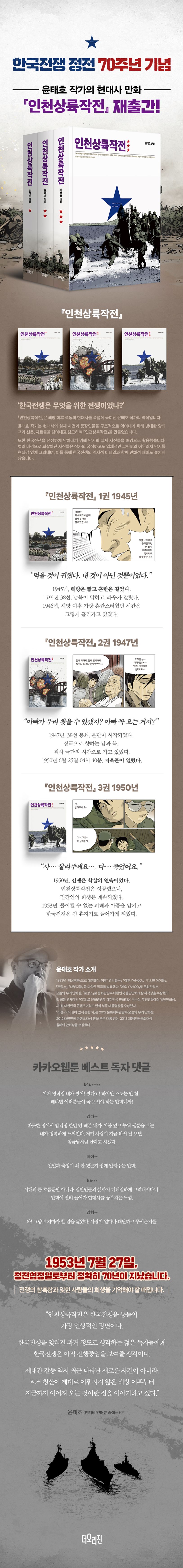 윤태호 작가의 웹툰 〈인천상륙작전〉이 단행본으로 독자들을 찾아왔다. 2015년 부천만화대상 ‘대상’ 수상작인 웹툰 〈인천상륙작전〉은 2013년 네이트에서 연재 후 2017년 카카오웹툰에서 재연재한 작품이다. 2013년 한겨레출판에서 전 6권으로 출간되었으나, 2023년 정전협정 70주년을 기념해 ㈜북이십일 더오리진에서 전 3권으로 새롭게 편집·디자인·개정하여 출간되었다.