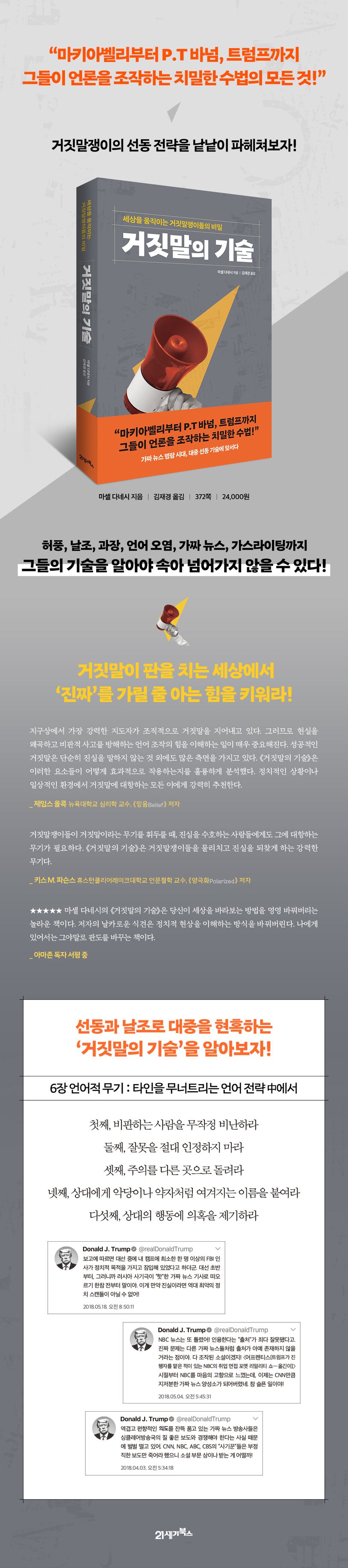 2016년 치러진 미국 대선은 전 세계를 많은 화두를 던졌다. 바깥에서 바라볼 때는 터무니없어 보이는 거짓말쟁이가 노련한 정치가를 누른 이 선거의 결과를 두고 세계 곳곳에서 많은 이들이 “어떻게 트럼프가 승리할 수 있었을까?”를 논의하며 여러 의견을 내놓았다. 세계적인 기호학자이자 정치인의 언어 전략에 대해 꾸준히 연구해 온 마셀 다네시 토론토대학교 교수는 닉슨 대통령의 워터게이트사건을 회고하며, 트럼프의 당선이 워터게이트 이후로 소강상태에 빠졌던 “거짓이라는 암이 재발한 것과 같다”고 진단한다. “부도덕한 사업가가 우연히도 정치가가 되었고 그 정치가가 거짓말쟁이임이 분명해 보이는데, 어째서 이렇게나 많은 사람이 기꺼이 그의 말을 신뢰하면서 열띤 지지를 보내는 것일까?”(《거짓말의 기술》 서문 중) 이러한 의문에서 시작하는 마셀 다네시의 《거짓말의 기술》은 트럼프를 비롯해 역사를 크게 뒤흔들었던 거짓말쟁이들의 비밀을 낱낱이 파헤친다. 번드르르한 기만과 선동으로 권력을 잡은 무솔리니, 끔찍한 전쟁과 학살을 일으킨 히틀러 등 역사 속에는 자신의 목적을 위해 타인을 기만하고 속여 큰 해악을 끼친 거짓말쟁이들이 언제나 존재한다. 그러나 인류는 이들로 인해 여러 비극을 겪고도 또다시 누군가의 허언과 선동에 마음을 빼앗기는 역사를 반복한다. 대체 그들의 거짓말에는 어떠한 속성이 있기에 이러한 악순환을 반복하는 것일까? 타인을 현혹하는 거짓말쟁이들의 비밀은 과연 무엇일까?