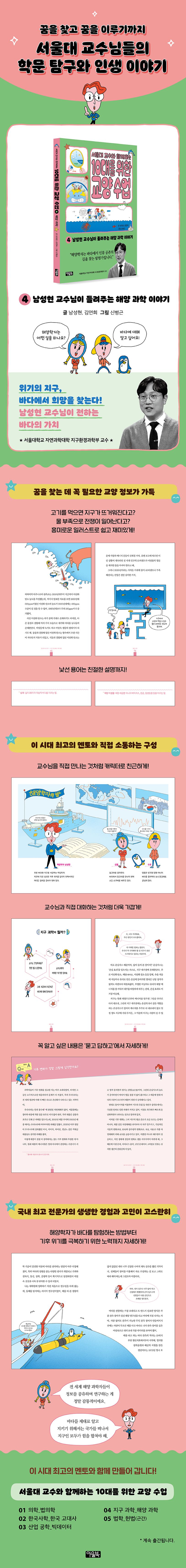 〈남성현 교수님이 들려주는 해양 과학 이야기〉는 『서울대 교수와 함께하는 10대를 위한 교양 수업』 시리즈의 네 번째 권으로, 배를 타고 거친 바다와 싸우며 직접 데이터를 수집하는 해양학자 남성현 교수님의 이야기를 담았습니다.