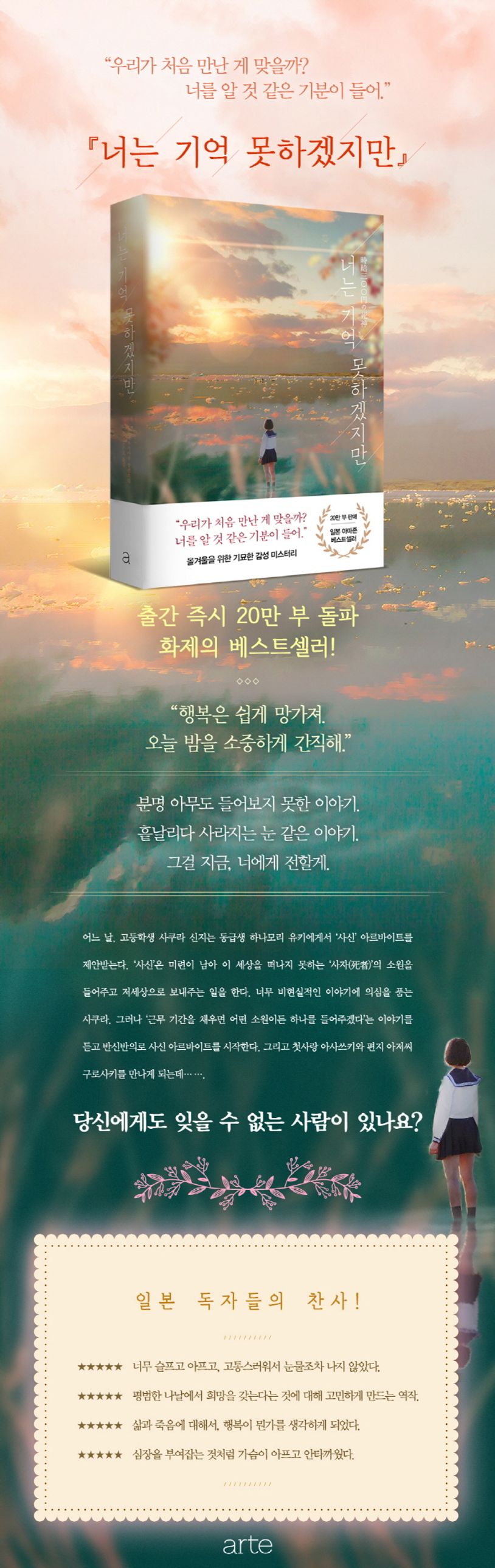 《내일 나는 죽고 너는 되살아난다》 시리즈의 저자 후지마루의 소설 『너는 기억 못하겠지만』. 감성 미스터리라는 새로운 장르에 도전한 저자의 이번 소설은 죽은 자와 대면하는 사신 아르바이트라는 어둡고 묵직한 설정의 가슴이 뭉클해지는 이야기를 담고 있다. 어느 날, 고등학생 사쿠라 신지는 동급생 하나모리 유키에게서 ‘사신’ 아르바이트를 제안 받는다. ‘사신’은 미련이 남아 이 세상을 떠나지 못하는 ‘사자(死者)’의 소원을 들어주고 저세상으로 보내주는 일을 한다.