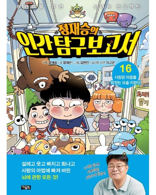 인간을탐구하기위해외계인들이도착했다!외계인의눈에비친우리는과연어떤모습일까?머나먼행성아우레의외계인들이지구에도착했습니다.위기에처한행성을버리고새로운행성으로이주하기위해서지요.푸른대지와하늘로뒤덮인아름다운행성,지구를발견한외계인들은지구인의모습을하고인간을알아보기위해지구에잠입합니다.외계인의눈에비친지구인은과연어떤모습일까요?쉽게화를내고,사소한문제로다투는지구인들은매우비이성적으로보입니다.외모에지나치게집착해서어리석은판단을내리고,그판단을후회하면서머리를쥐어뜯기도하지요.하지만동시에인간은이성과감성을조합해아름다운예술작품을만들어내고,빛나는호기심을간직한채우주를향해로켓을쏘아올리기도합니다.대체종잡을수없는지구인들을관찰하며,외계인들은신중하게작성한보고서를행성에전달합니다.뇌과학과함께나와세상을이해하기위한질문들의답을찾아나가보세요『정재승의인간탐구보고서』는외계인의눈으로인간을낯설게바라봄으로써우리들에대한이야기를독자여러분과나누고자합니다.외계인에게인간은무척이나이상하고낯선존재입니다.모순으로가득찬인간의비밀을풀기위해외계인들이던지는질문들은,놀랍게도우리가스스로에게던지는질문들과맞닿아있습니다.부모님의잔소리는왜듣기싫은지,분명히배웠는데시험때만되면기억이안나는이유는무엇인지,좋아하는여학생을보면오히려괴롭히고싶은이상한마음들은무척이나궁금하지요.뇌과학과심리학은이러한인간의마음을탐구하여우리에대한흥미로운설명을들려줍니다.『정재승의인간탐구보고서』에서우리는‘마음의과학’을통해나는누구이며,우리는어떤존재인지,나와세상을이해하기위해꼭필요한질문들의답을찾아나갈것입니다.인간의새로운모습을발견해내는외계인들의여정에함께해보세요.우리에대한이야기들은또다른질문으로이어져나와너,세상을더욱폭넓게이해하도록도와줄것입니다.줄거리드디어하나와대호가공개연애를시작했다!콩닥콩닥사랑의바람은꽁치와최고,루이에게도불어온다.그런데……하나와대호는첫데이트부터삐걱대기시작하고,꽁치,최고,루이의사랑도예상치못한방향으로흘러가는데.사랑에빠지면행복하기만한거아니었냐고!사랑에끝없이상처입으면서도계속해서사랑하고싶어하는지구인의알쏭달쏭한마음을외계인들이이해할수있을까?멀고먼다른은하계에서웜홀을뚫고태양계의지구까지온아우레탐사대.이들의눈에비친지구인들은어떤모습일까?지구인의마음을들었다놨다하는사랑을파헤치러,오늘도출발~!*인증유형:공급자적합성확인