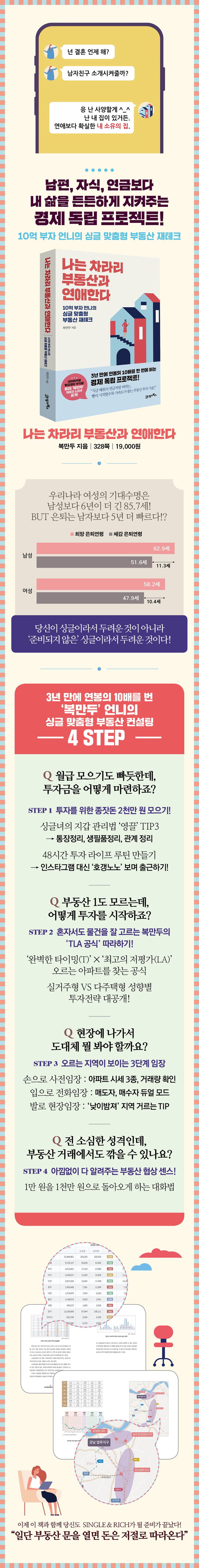 결혼 안 하냐는 고리타분한 질문을 받는다면 어떻게 대답해야 할까? 연애 상담으로 골머리를 앓고 있거나, ‘남 편’으로 인해 고통받으면서도 싱글인 사람들을 걱정해주는 척하는 친구들에게서 벗어나고 싶다면? 여기 결혼 대신 스스로 당당히 세대주가 된 한 싱글 여성의 이야기를 소개한다. 아무런 준비 없이 버는 족족 써버리는 ‘준비 안 된’ 싱글이 아니라, 부동산 투자로 스스로의 자산을 마련한 ‘준비된’ 싱글의 삶은 누구보다 안정적이고 여유로우며, 자유로운 삶을 보장할 것이다.