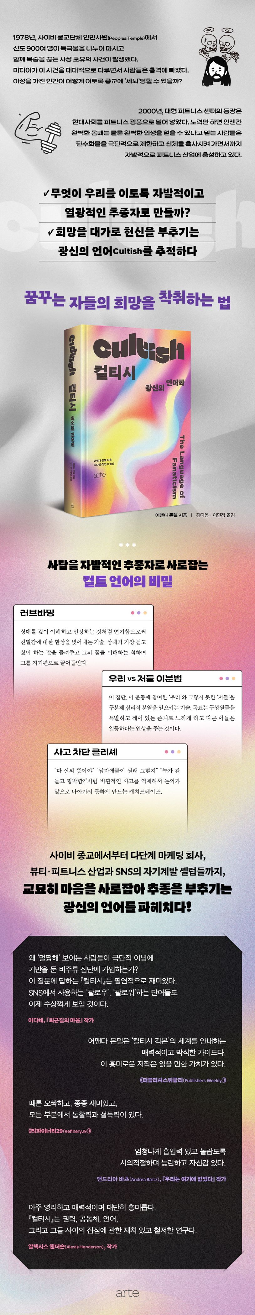 작가이자 언어학자인 어맨다 몬텔은 유년기를 극단적 컬트 공동체에서 보내다 탈출한 아버지의 영향으로 어릴 적부터 컬트 언어에 관심을 가졌다. 그는 『컬티시: 광신의 언어학』에서 사이비 종교에서부터 다단계 마케팅 회사, 뷰티·피트니스 산업과 SNS 인플루언서들까지, 사람을 매료시키는 온갖 논쟁적인 컬트를 취재하여 그가 ‘컬티시(Cultish)’라고 이름 붙인 ‘광신의 언어’를 추적한다.