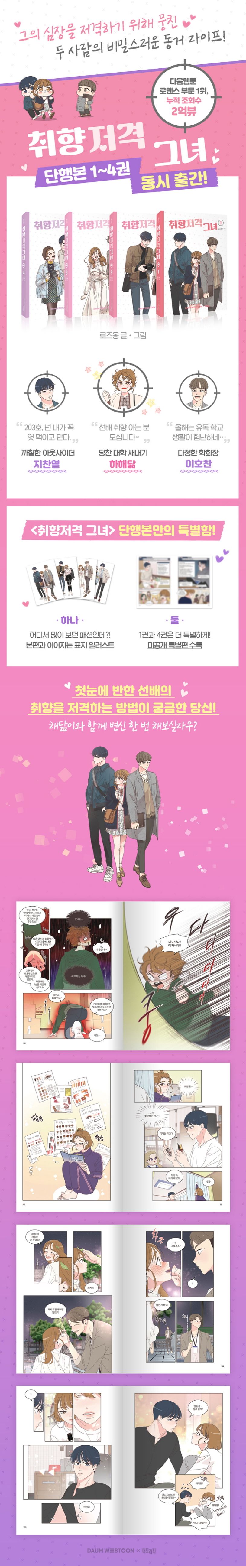 화려한 그림체와 매력적인 캐릭터로 다음웹툰 부동의 인기를 자랑하는 『취향저격 그녀』가 단행본으로 출간되었다. 『취향저격 그녀』는 다음웹툰 누적 조회 수 2억 건, 주간 연재 랭킹 1위, 평점 9.9 등의 각종 수식어를 끌어안은 로맨스 웹툰이다.