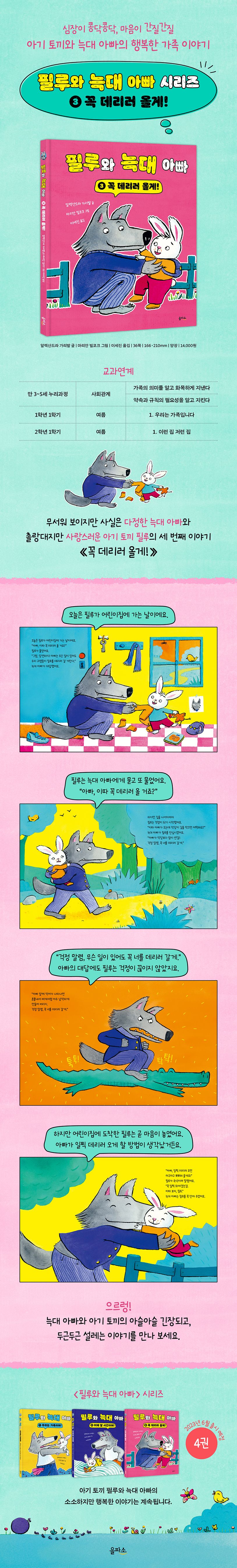 《필루와 늑대 아빠》 시리즈의 세 번째 이야기 《꼭 데리러 올게!》는 분리불안에 대한 이야기입니다. 어린이집에 가는 길, 필루는 자신을 데리러 오는 아빠에게 혹시라도 무슨 일이 생길까 봐 걱정이 한가득이에요. 그런 필루에게 늑대 아빠는 무슨 일이 있어도 꼭 데리러 오겠다며 굳게 약속하지요. 아이의 분리불안을 해소하는 방법 중 하나가 부모의 믿음직한 약속이라고 합니다. 서로에 대한 사랑과 신뢰를 바탕으로 건강한 가족 관계를 만들어 나가는 것이지요.