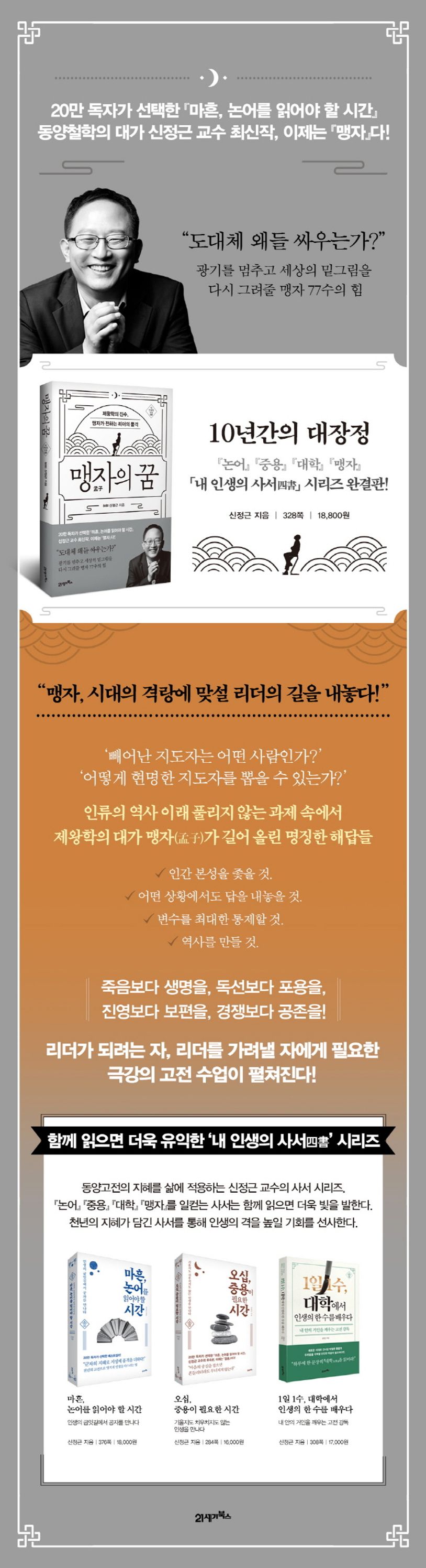 『맹자의 꿈』은 『마흔, 논어를 읽어야 할 시간』, 『오십, 중용이 필요한 시간』, 『1일 1수, 대학에서 인생의 한 수를 배우다』에 이은 「내 인생의 사서(四書)」 시리즈 완결판으로서, 흔들리지 않고 자신의 길을 뚜벅뚜벅 걸어가며 새로운 시대를 여는 초인의 리더십을 기대하는 현대사회에 생각의 지평을 넓혀줄 지혜와 통찰을 선사할 것이다.