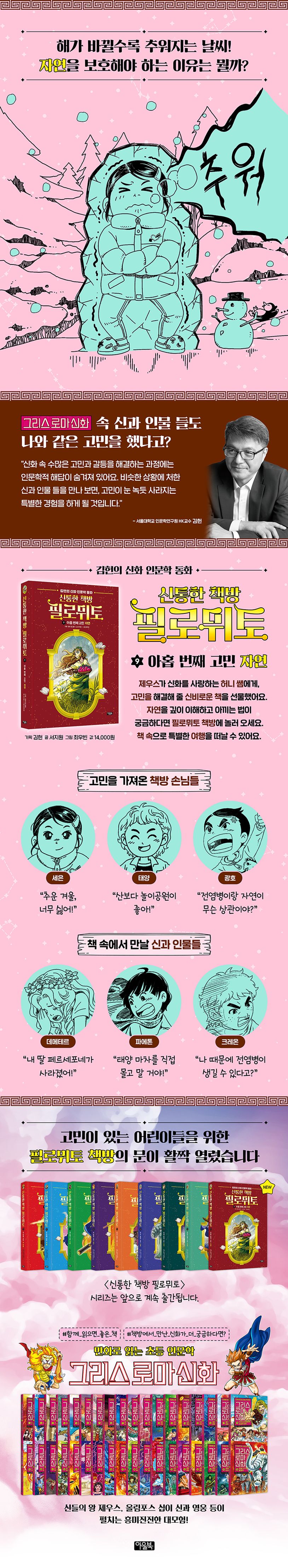 신화 속으로 여행을 다녀온 친구들은 거대한 자연의 섭리 속에서 인간들이 어떤 지혜를 가지고 살아가야 하는지 실마리를 얻게 되지요. 친구들에게 어떤 일이 벌어졌는지 궁금하다면 〈신통한 책방 필로뮈토〉 9권을 펼쳐 보세요.