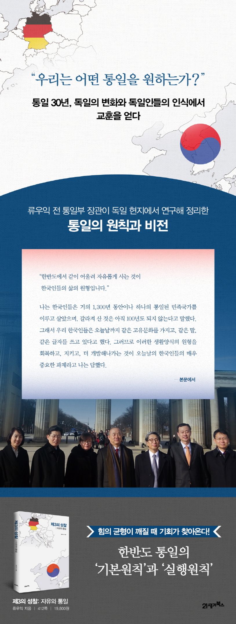 평화를 바라는 것만으로는 평화가 오지 않는다. 그리고 소원을 비는 것만으로는 통일이 오지 않는다. 우리가 원하는 통일은 무엇인지, 통일을 위해서 무엇을 어떻게 준비해야 할지를 알고 있어야 하며 미리 준비가 되어 있어야 한다. 이런 준비가 되어 있을 때야 저자가 한반도를 위한 시대정신이라고 밝힌 ‘자유와 통일’의 결합이 비로소 가능해지는 것이다. 이 책이 궁극적으로 말하고자 하는 것이 바로 이것이다.