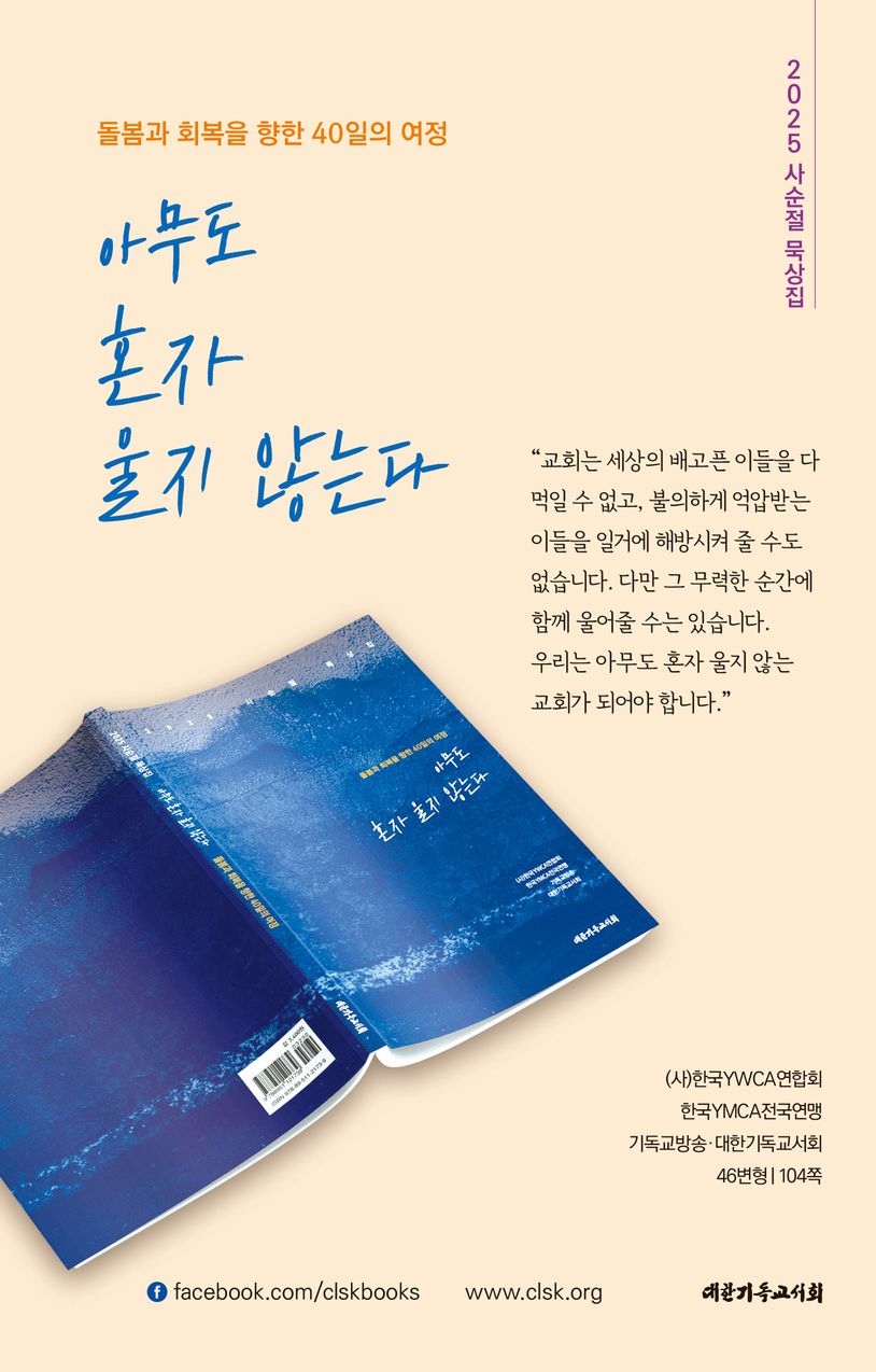 2025년 사순절 묵상집 『아무도 혼자 울지 않는다』는 ‘돌봄’을 주제로 예수님이 받으신 고난의 의미와 부활을 소망을 되새기며 우리의 신앙과 삶을 성찰하도록 돕는 경건 묵상집이다.