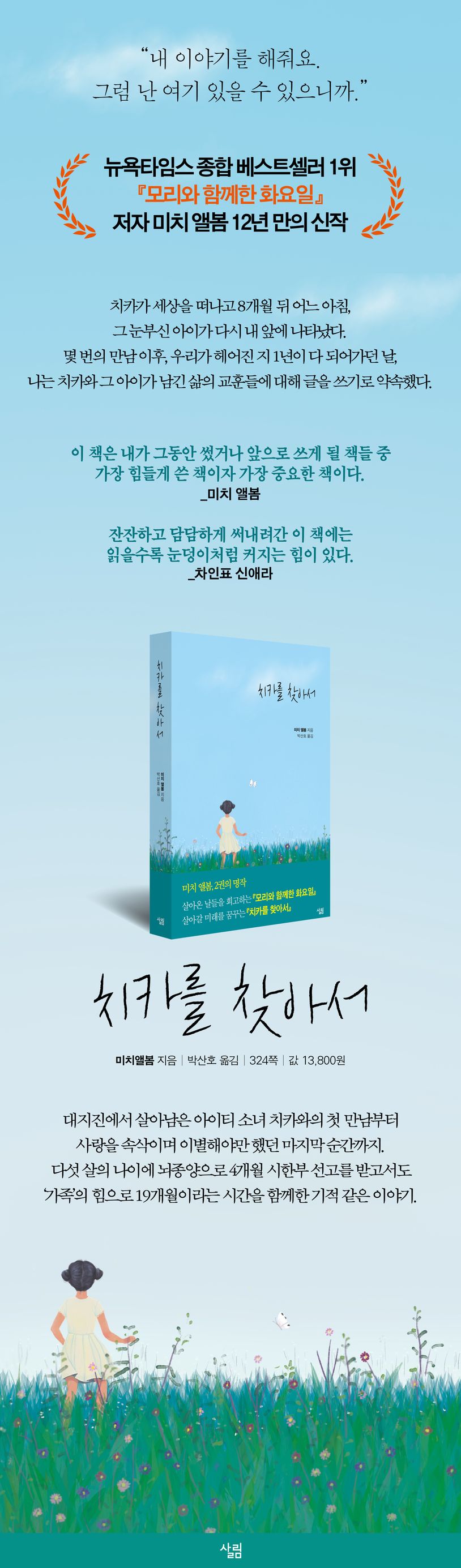 『치카를 찾아서』는 아이티 지진에서 살아남은 다섯 살 시한부 소녀 치카와 미치 앨봄이 만나 가족이 되어 가는 과정을 그린 이야기로 『모리와 함께한 화요일』 이후 12년 만에 돌아온 세계적인 베스트셀러 작가이자 휴머니스트인 미치 앨봄이 다시 한번 우리 삶의 고통과 행복을 어루만진다.