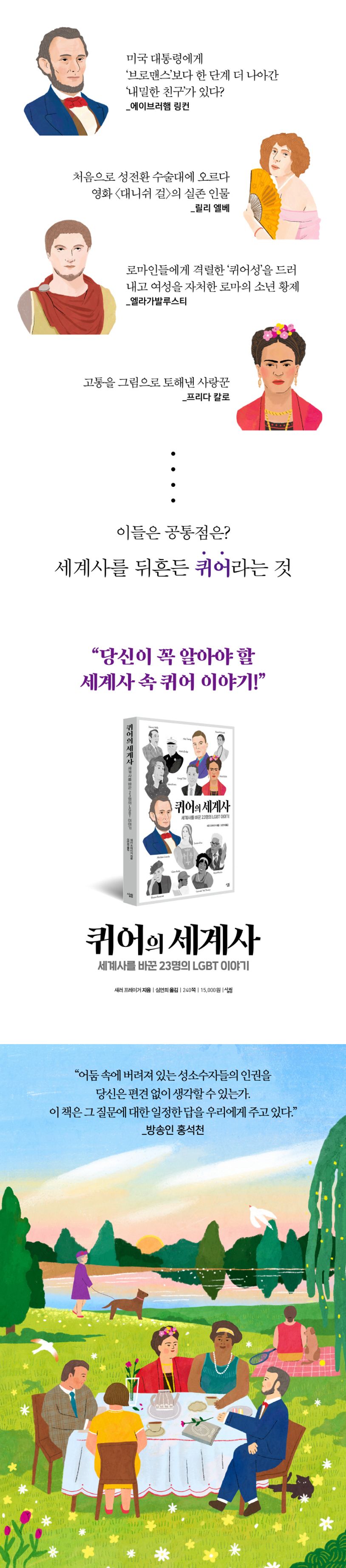 퀴어(queer)는 모든 대륙에서 어느 시대나 역사의 일부로 존재해왔다. 이 책은 세계사 속 23명 성소수자들의 이야기이다. 우리는 분명 이 책의 수많은 퀴어 역사 속 인물에 대해 들어본 적이 있을 것이다.