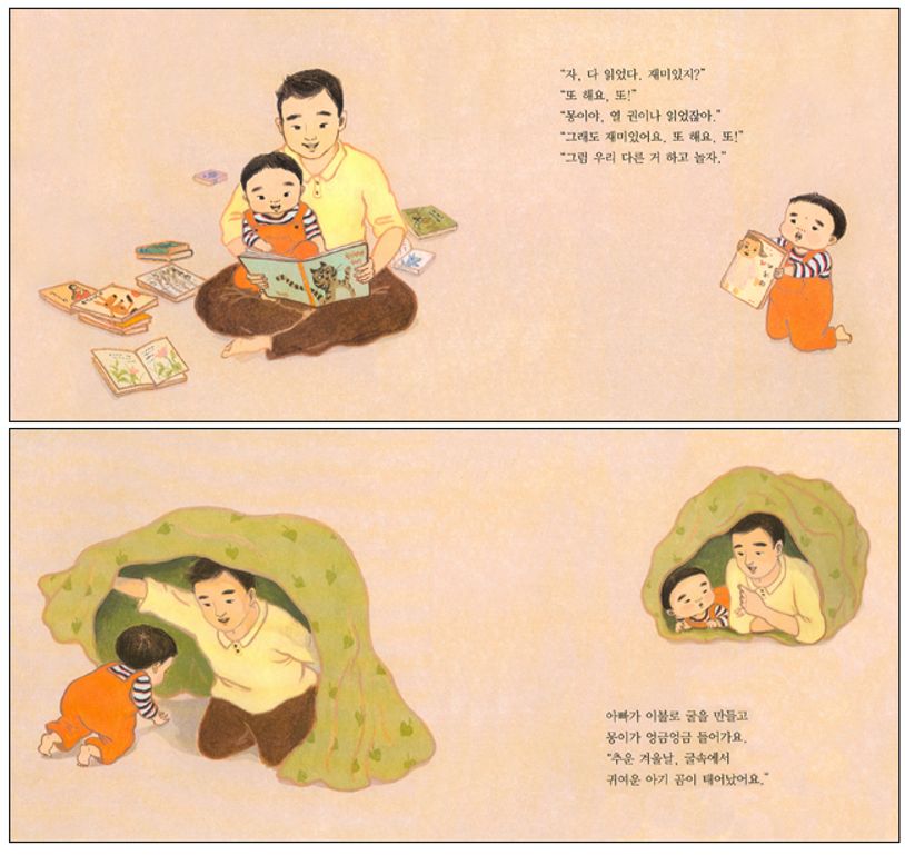 ⑤또해요또:책을읽어주면몽이는외친다.“또해요또!”기차놀이를해도외친다.“또해요또!”그런몽이에게아빠는아기곰놀이를제안하고,이불로굴을만들어안으로쏙들어간다.아빠는겨울잠을자는아기곰이야기를시작하고,몽이는스르르잠이든다.몽이는잠꼬대로“또해요또!”를외치면서도곧잠이든다.