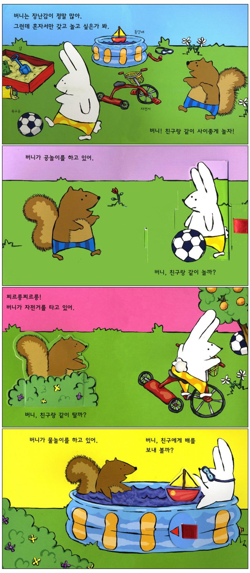 버니는 장난감이 정말 많아. 축구공, 돛단배, 자전거, 그리고 삽 등이 버니의 장난감이야. 그런데 혼자서만 갖고 놀고 싶은가 봐. 버니가 친구랑 사이좋게 놀 수 있도록 도와주지 않을래? 플랩북 / 팝업북.