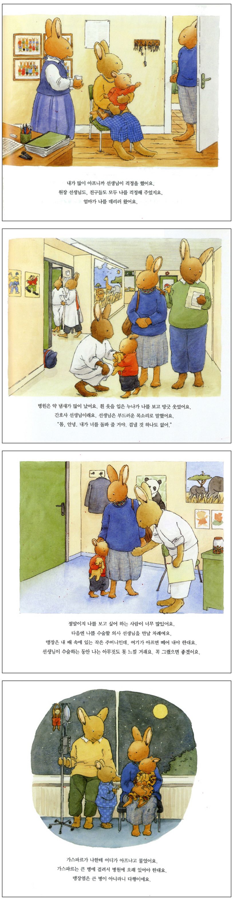 <네버랜드마음이자라는성장그림책>은아이들이생활속에서겪는다양한일들을담은따뜻한생활동화로,날마다크는우리아이들에게격려와위로를전해줍니다.또하루하루일어나는일들이성장의밑거름이되어,아이들이꼬마친구톰처럼씩씩하게자라날수있도록도와줄것입니다.각권의이야기끝에는‘부모님을위한우리아이성장이야기’라는공간을마련하여,주제와연관된도움글을실었습니다.아이들은생활속에서많은고민과어려움을겪습니다.그럴때부모와아이가어떻게이야기를나누며풀어나갈지를이책은잘보여주고있습니다.책속의일들을경험했거나경험하고있는아이라면,이책을읽으며?자신의감정을이해받고또마음속에남아있던응어리를풀어볼기회를갖게될것입니다._신철희(신철희아동청소년상담센터소장)작품의특징병원은무서운곳이아니라아픈곳을낫게해주는곳!요즘아이들은병원에자주간다.예방접종도많아지고,어린나이부터단체생활을하다보니질병에쉽게노출되기때문이다.하지만자주간다해도늘가기싫고무서운곳이바로병원이다.이책의톰도병원이무섭기는마찬가지다.더군다나수술까지해야한다니!하지만엄마아빠,의사,간호사모두톰이마음의준비를할수있도록도와준다.“주사는안맞을거야.”라고거짓말을하지도않고,“말안들으면주사놓아달라고한다!”라며병원을두려움의대상으로인식시키지도않고,“안울면장난감사줄게.”라는달콤한말로아이를달래지도않는다.대신왜병원에가야하며,어떤과정을통해치료를받을건지,솔직하게차근차근설명해준다.이책을읽는아이들은병원에가서치료를받아아픈것도낫고,좋은친구도사귀는톰의모습을통해,병원에대한막연한두려움을이겨낼수있을것이다.작품의내용톰은유치원에서갑자기배가아파서급히병원에간다.맹장염이라서수술을받아야한다는데,톰은병원이라는곳이썩내키지도않고,뭔지는모르지만수술하는것이마냥두렵기만하다.하지만친절한의사선생님과간호사선생님을만나고,좋은친구를사귀면서,톰은두려움을이겨내고수술도잘받게된다.