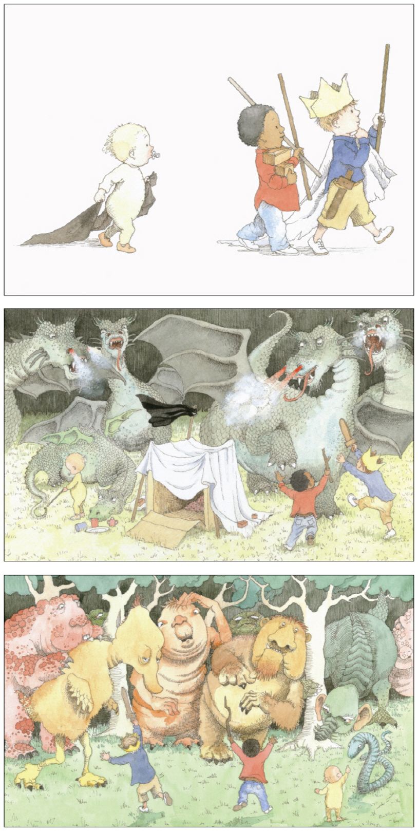 “놀이를통해몸과마음이건강하게자라는아이와진정한용기와자존감을주는엄마아빠의사랑”을보여주는사랑스러운그림책아이들은놀이를할때더욱건강하게자란다아이들은뛰면서놀고,뒹굴면서놀고,싸우듯놀고,상상하면서논다.다양한놀이는아이에게다채로운경험과풍부한상상력을준다.그래서제대로,잘노는아이들은몸과마음이건강하게자란다.《나는용감한잭임금님》의잭도그런아이들중하나다.오늘잭은상상놀이를하기로마음을먹는다.그래서큰종이상자,낡은이불,막대기,깨진벽돌,마대로용과괴물을상대할성을만든다.치열한전투를치른후에맛난간식을먹고한차례휴식도갖는다.어린두동생이떠나간후에도홀로성을지키겠다고큰소리친다.그러나캄캄한어둠과불어오는밤바람,야행성동물들의소리에점차주눅이든다.그래도자기는용감한임금이라고스스로를달래보지만,이내강한공포앞에서자신의감정을솔직하게드러내고급기야엄마아빠를부른다.이렇게잭은놀이를통해스스로를지키려는의지,공포,그리고도움을구할줄아는대처능력들을자연스럽게터득해간다.놀시간이턱없이부족하고,어떻게놀아야할지어른이방법을알려주어야노는요즘아이들은간접경험과상상력이부족한현실에놓여있다.이런현실에서살아가는아이들과부모들에게이책은아이들의건강하게성장하는데놀이가얼마나중요한지를다시한번이야기한다.놀이시간은아이들이단순히노는시간이아니라건강하게자라는소중한시간임을말이다.부모의사랑과배려가아이의용기와자존감을키운다이작품에서잭을대하는잭의엄마아빠를통해우리는아이와아이의세계를존중해주는부모의모습을엿볼수있다.해가지도록온종일밖에서노는아이를데리러온엄마아빠가잭에게던진첫말은“이렇게캄캄해질때까지집에안오고뭐하고있는거니?”라는말이아니었다.“내일유치원가려면얼른씻고잠자야지.”라는재촉의말도아니었다.바로“밤이되었으니용감한임금님도이제그만들어가서쉬어야죠?온종일용들과싸웠으니이제깨끗이씻으러갈까요,용감한임금님?”하는말로잭의엄마아빠는아들이몰두한놀이의세계를인정해주었다.어른들의시간으로아이가이루어놓은세계를함부로무너뜨리지않았다.잭에게는어둑어둑한저녁시간도아직성을지켜야하는시간이었다.잭의엄마아빠는아들이진정되고싶어하는것이무엇인지를단박에알아채었다.늦은시간까지성을지키고자했던이유를이해했다.그래서대번잭을“용감한임금님”이라고치켜세웠다.자신의세계를알아주는부모앞에서잭은휭불어오는바람소리와부엉이소리앞에서움츠렸던가슴을활짝펴고당당하게소리친다.“네발달린용따위무섭지않아!”라고.부모의사랑과배려가아이의용기와자존감을어떻게키우는지를이작품은깊이있게보여준다.《나는용감한잭임금님》은온가족이함께읽으며울림과교훈을공유하면더욱좋을작품이다.아이들의모습을섬세하게포착한글과그림부드러운선,따뜻한색감,아이들의표정과몸짓을읽어내는탁월한관찰력으로언제나훈훈한그림을선사해온헬린옥슨버리.이번작품에서도옥슨버리는그녀특유의섬세하고따뜻한기운으로개성있고사랑스러운캐릭터들을만들었다.종이를오려만든왕관을머리에쓰고나무칼자루를손에쥐고종일전투를진두지휘하는잭임금과,고무젖꼭지를입에문채말없이형들을졸졸따라다니는우주복차림의캐스퍼,흘러내리는바지와헐렁한티를입은자크.이사랑스러운삼총사와대결하는날개달린포악한용과게으르고굼떠보이는괴물들……용들과의치열한전투에서손발들고싸우는잭의모습과는달리,막대기로누워있는용꼬리를툭치며호기심어린자세로가만히서있는아기캐스퍼의모습을보면절로웃음이나온다.삼총사가많은말을하지않지만그림을통해서개구쟁이잭과어린두동생의모습,자크와캐스퍼를데려가는엄마아빠를거인이라고칭하는이야기,나무칼을손에쥔채잠이들기까지놀이의세계에집착하는잭의모습은영락없이우리아이들의모습을담고있다.《나는용감한잭임금님》은아이들의정서와모습을섬세하게포착한글ㆍ그림작가의빼어난솜씨로아이들의시선과마음을고스란히담은작품이다.