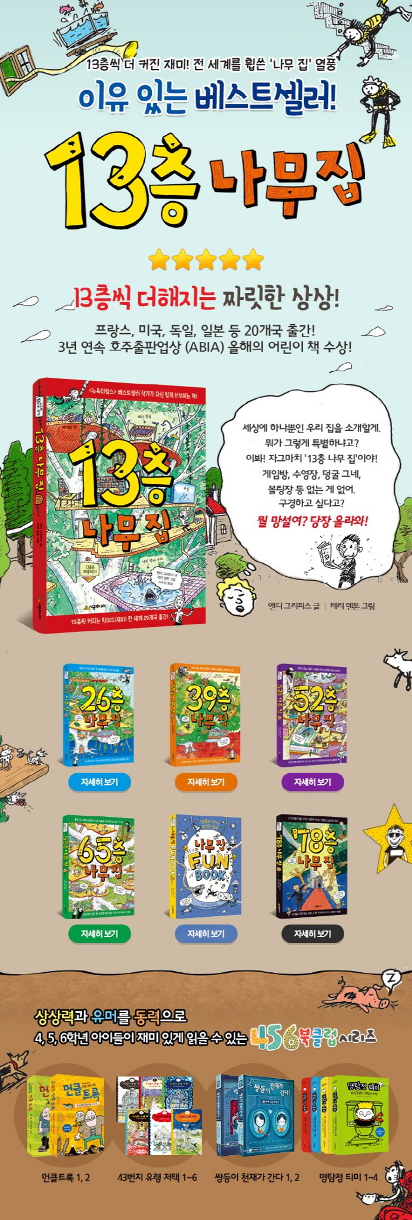 흥미진진한 모험 이야기에는 빠지지 않고 등장하는 ‘나만의 공간’을 본격적으로 보여주는 『13층 나무 집』. 앤디와 테리가 사는 ‘13층 나무 집’에는 수영장, 전망대, 거대 새총, 게임방, 볼링장, 덩굴 그네 등 놀거리는 물론, 앤디와 테리를 따라다니며 입안에 마시멜로를 쏘아 주는 로봇, 레모네이드가 뿜어져 나오는 분수, 풍선껌이 끊이지 않고 나오는 기계 등 먹을거리도 가득하다. 쉴 틈 없이 현실과 상상을 넘나드는 짜릿한 모험이 여러분들을 기다리고 있다.