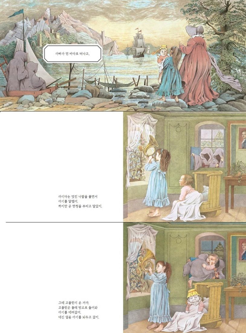 1982년 칼데콧 아너 상 수상작 『잃어버린 동생을 찾아서』. 작품의 주인공은 아이다라는 이름의 한 소녀입니다. 아이다의 아빠가 먼 바다로 항해를 떠나자, 엄마는 깊은 슬픔에 빠지고, 어린 동생을 돌보는 일은 자연히 아이다의 몫으로 돌아옵니다. 그러던 어느 날, 아이다에게 큰 시련이 찾아옵니다. 아이다가 잠시 한눈판 사이에 고블린들이 나타나 요람 안에 있던 동생을 데리고 가 버린 것이지요. 혼란 속에 빠져 있던 아이다가 동생을 구하러 떠나면서 작품의 본격적인 이야기가 시작됩니다.