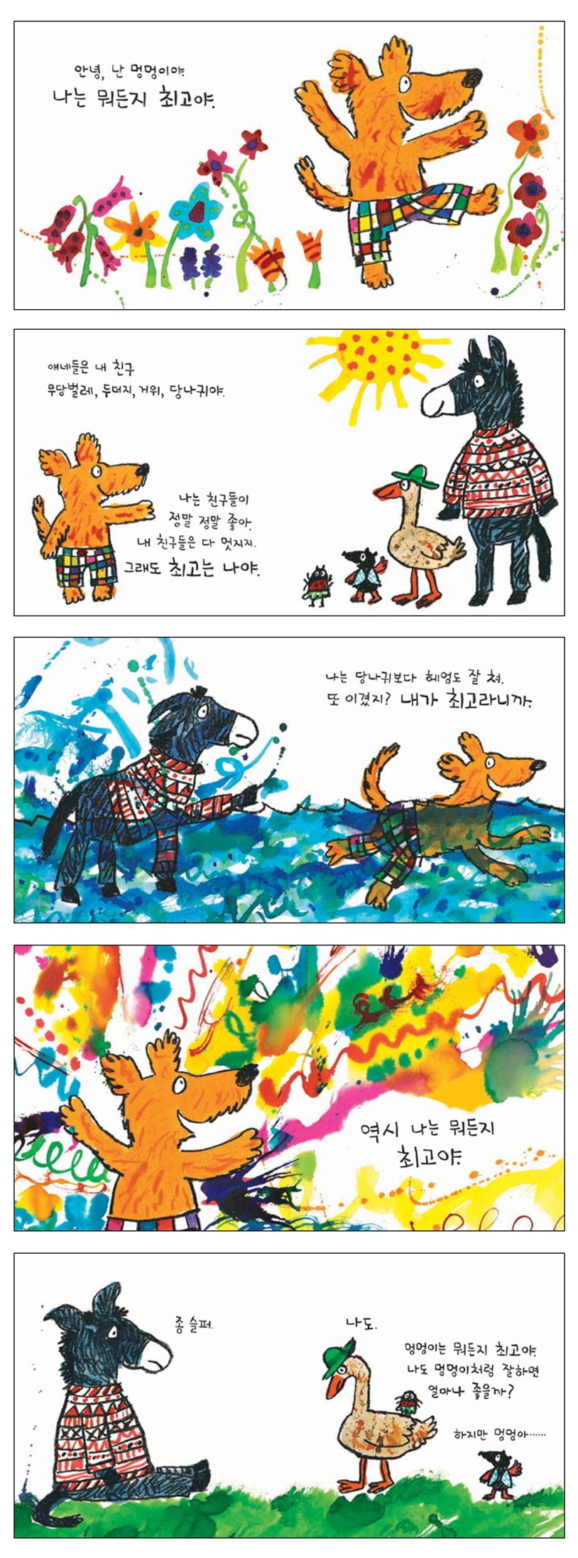 멍멍이는 두더지, 거위, 당나귀, 그리고 무당벌레 등 친구들이 정말 멋지고 좋지만 자신이 최고라고 생각하고 있다. 두더지보다 빠르고, 거위보다 땅을 잘 파고, 무당벌레보다 크고, 당나귀보다 헤엄을 잘 친다고 뻐긴다. 친구들은 멍멍이를 부러워하면서 침울해 했다. 하지만 두더지는 멍멍이보다 땅을 잘 파고, 당나귀는 멍멍이보다 크고, 거위는 멍멍이보다 헤엄을 잘 친다. 무당벌레는 멍멍이에게 없는 날개로 날 수도 있다. 멍멍이는 자신이 잘하는 것이 없다고 말하면서 엉엉 울었는데……. 아이들에게 누구나 잘하는 것이 있음을 일깨워주고 있다. 아울러 누구나 잘하는 것이 있으면 못하는 것도 있음을 보여준다. 친구 간의 진정한 우정의 소중함도 느낄 수 있다.