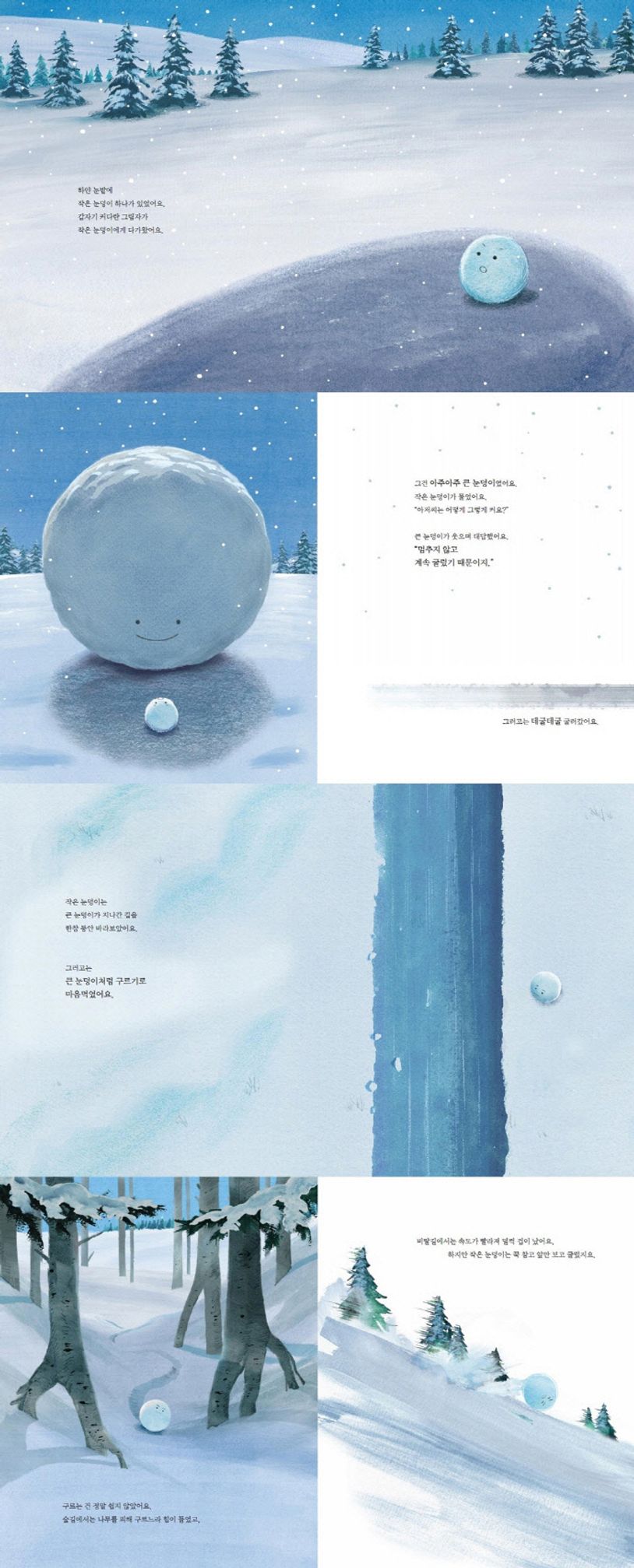 "내 힘으로 계속 구를 거야! 그래야 내가 원하는 것이 무엇인지 알 수 있어!" 『작은 눈덩이의 꿈』은 아이들에게 용기와 희망을 주는 그림책입니다. 하얀 눈밭에 작은 눈덩이 하나가 있었습니다. 갑자기 커다란 그림자가 작은 눈덩이에게 다가왔지요. 그건 아주 큰 눈덩이였어요. 작은 눈덩이는 큰 눈덩이처럼 구르기로 마음 먹습니다. 과연 큰 눈덩이가 될 수 있을까요?