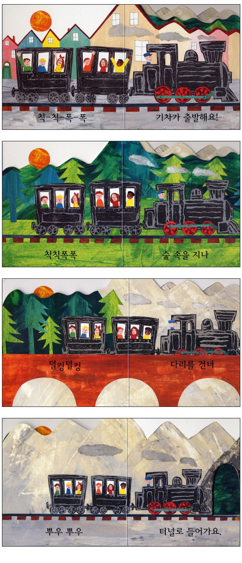 '알록달록 아기 그림책' 시리즈, 제15권 『기차가 칙칙폭폭』. 이 시리즈는 2세부터 4세까지의 유아를 위한 장난감 같은 그림책으로 구성되어 있다. 화려하고 밝은 색깔로 그려진 그림은 유아들의 눈을 사로잡기에 충분하다. 제15권 『기차가 칙칙폭폭』에서는 아이들이 칙칙폭폭 기차를 타고 어디론가 출발한다. 숲속을 지나 다리를 건너 터널로 들어간 기차는 어디로 가는 것일까? 그림의 모양에 따라 오려져 있거나 구멍이 뚫려 있어 아이들의 흥미를 불러일으킨다. 아울러 몸에 무해한 UV 코팅을 하여 아이들이 입으로 물고 빨아도 안전하다.